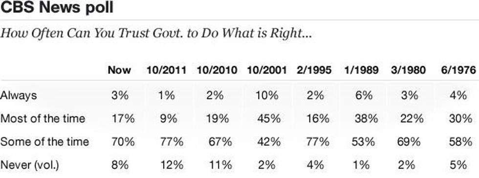 According to a CBS News poll, in the 1980s only three percent of Americans trusted the government always, compared to the 69 percent of Americans who trusted the government sometimes. In 2013(labeled as “now”), the Americans who trusted their government always stayed at three percent while the amount of Americans who trusted their government sometimes raised to 70 percent. One of the citizens interviewed by CBS News believed the government, “[doesn’t] know what’s going on with the common man.” While another states, “They (politicians) cannot be trusted to work together.”
