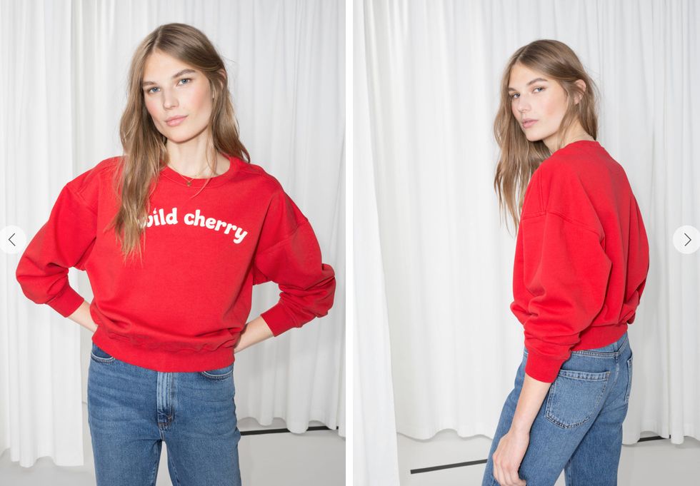Much of these designs along the theme of fruit give a nod to some of the fashion trends of the 90's, with under-sized cap sleeve tees and other similar pieces such as a graphic print pullover with a vintage font overtop, from & Other Stories. Wear these pieces out with some friends, to the park, to a theme park, or a picnic. Hey, even a trip to the corner store could work. Not only are there tops inspired by cherries, but an entire outfit can be created with cherries as the theme. Crack open a can of cherry coke and splendor at some of the sweetest designs of the season.