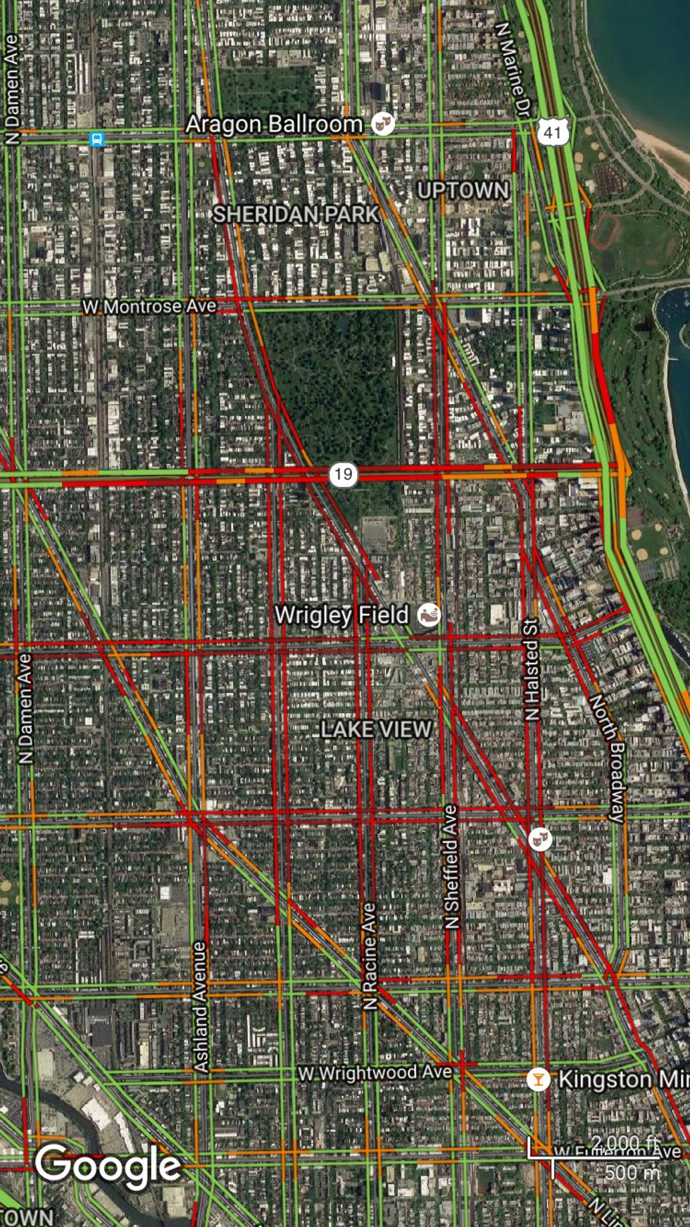 That is a picture of Chicago and the area around Wrigley field right after the game. The game was in Cleveland. This is not traffic of people leaving the stadium. This is red for all the people in the streets celebrating.