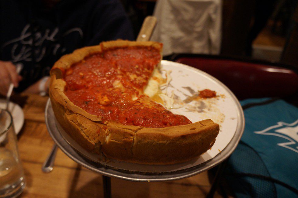 An hour and a half later our hunger took over and it was time for dinner, so in true Chicago tourist fashion we got a cab to the nearest Giordano’s Chicago style pizza restaurant. Giordano’s is one of Chicago’s most popular chain restaurants and it showed; we waited an hour for just the two of us to be seated. The wait was well worth it though once the beautiful cheesy pizza arrived. We still had a few slices left, so we took them to go.