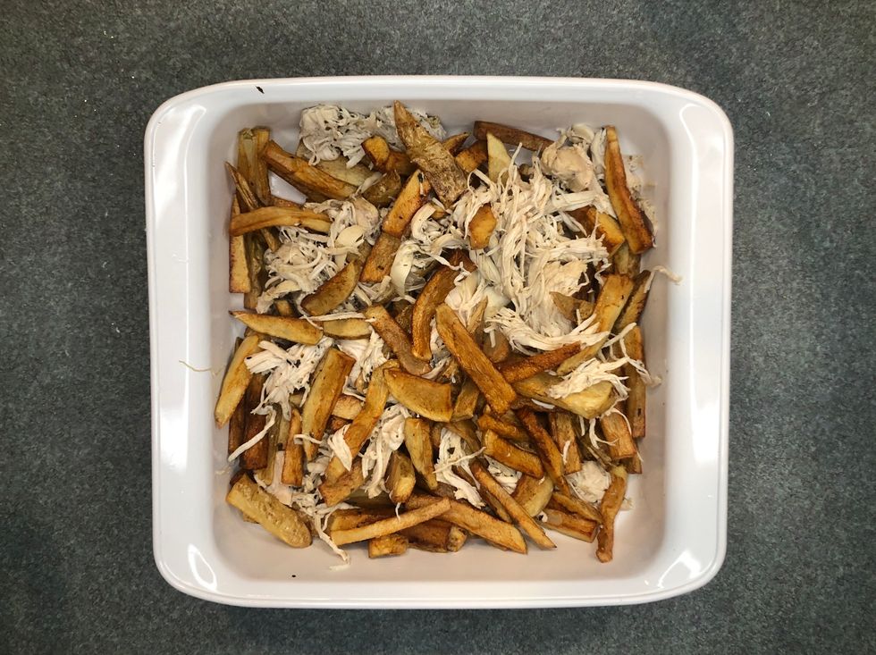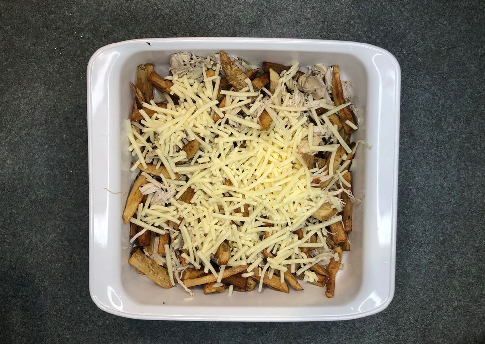 Open the Instant Pot. Tear apart the chicken breasts and use tongs to transfer the shredded chicken into the 8x8 baking dish. Mix up the chicken and fries. You may or may not use both breasts, depending on how chicken-heavy you want your fries to be.