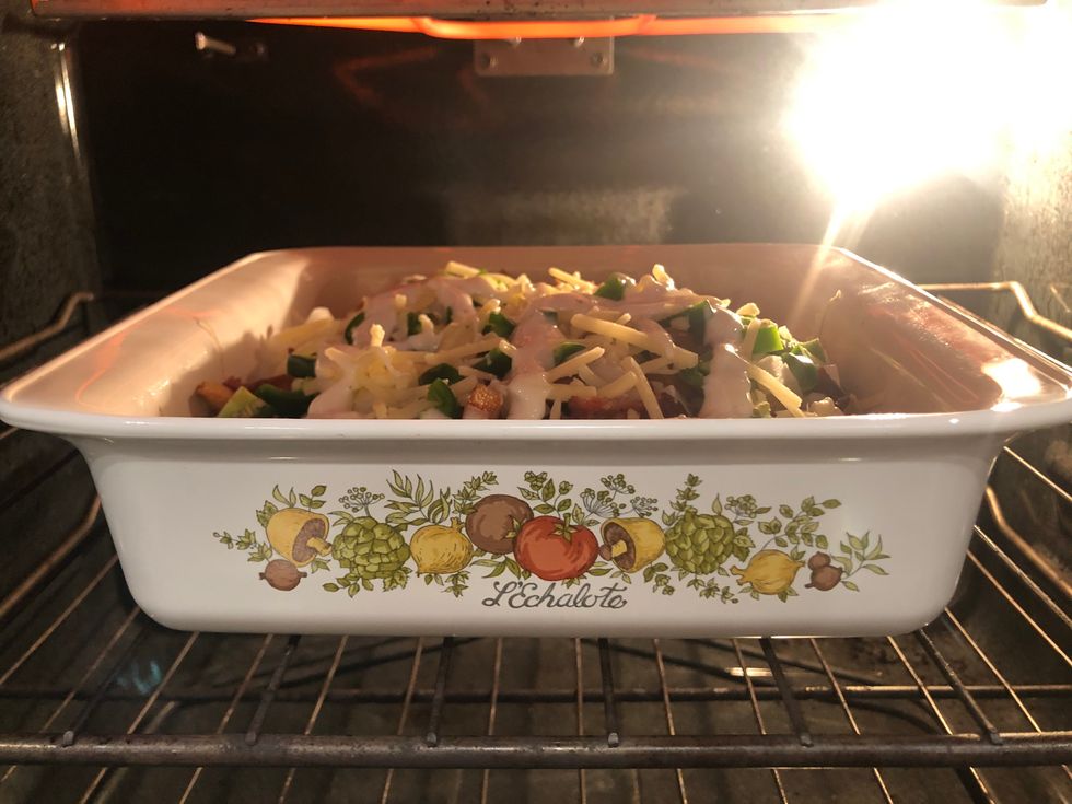 1. Put about 1" vegetable oil into a deep pan and turn the stove on high. Adjust oil usage for larger pans/deep fryers. When the oil is hot, use a skimmer to carefully load a batch of potatoes. Remove the potatoes using the skimmer when they are soft and golden brown and place them onto a plate lined with paper towels to soak up excess grease. Place them in the 8x8 baking dish after a few minutes of cooling.