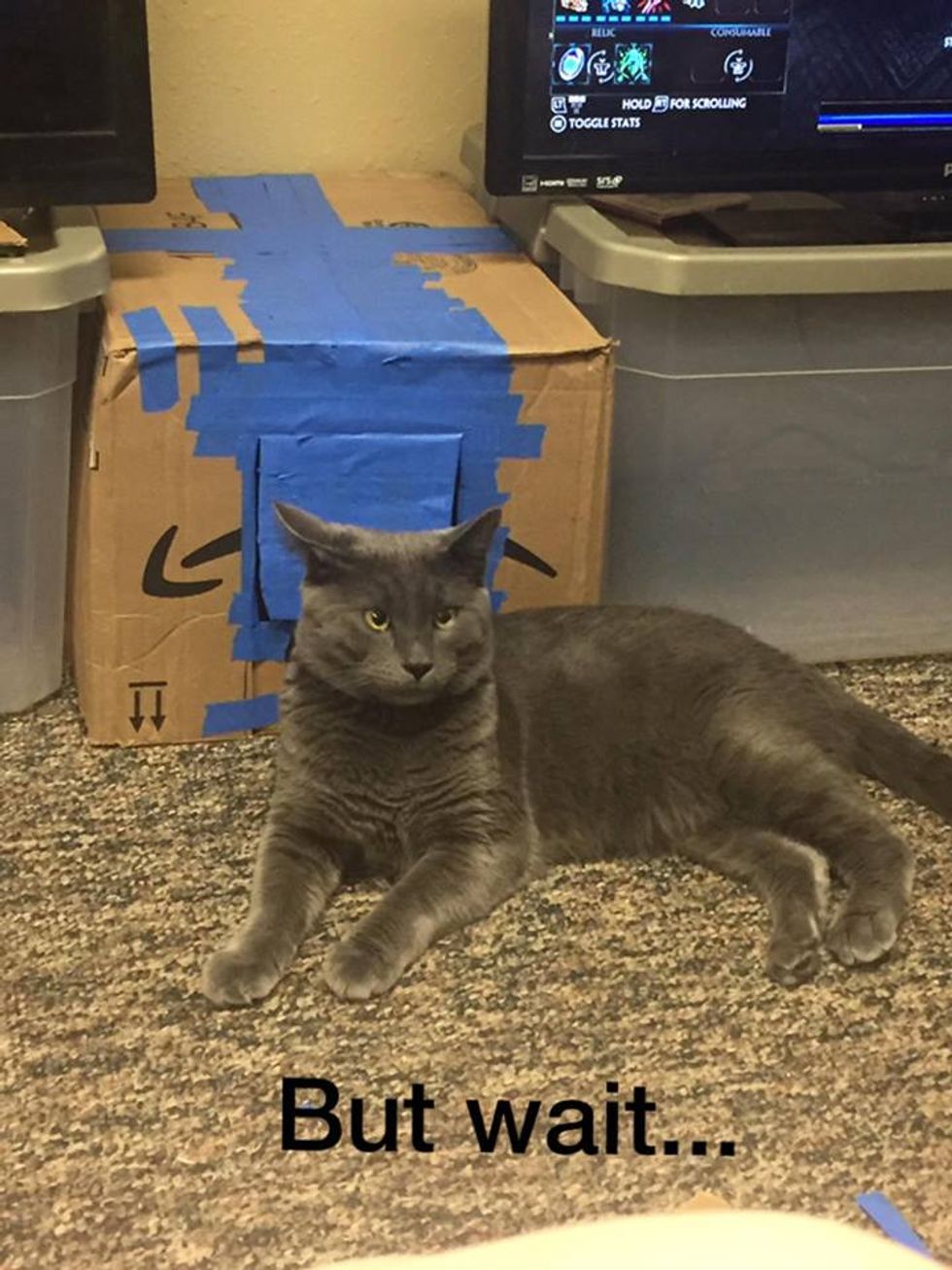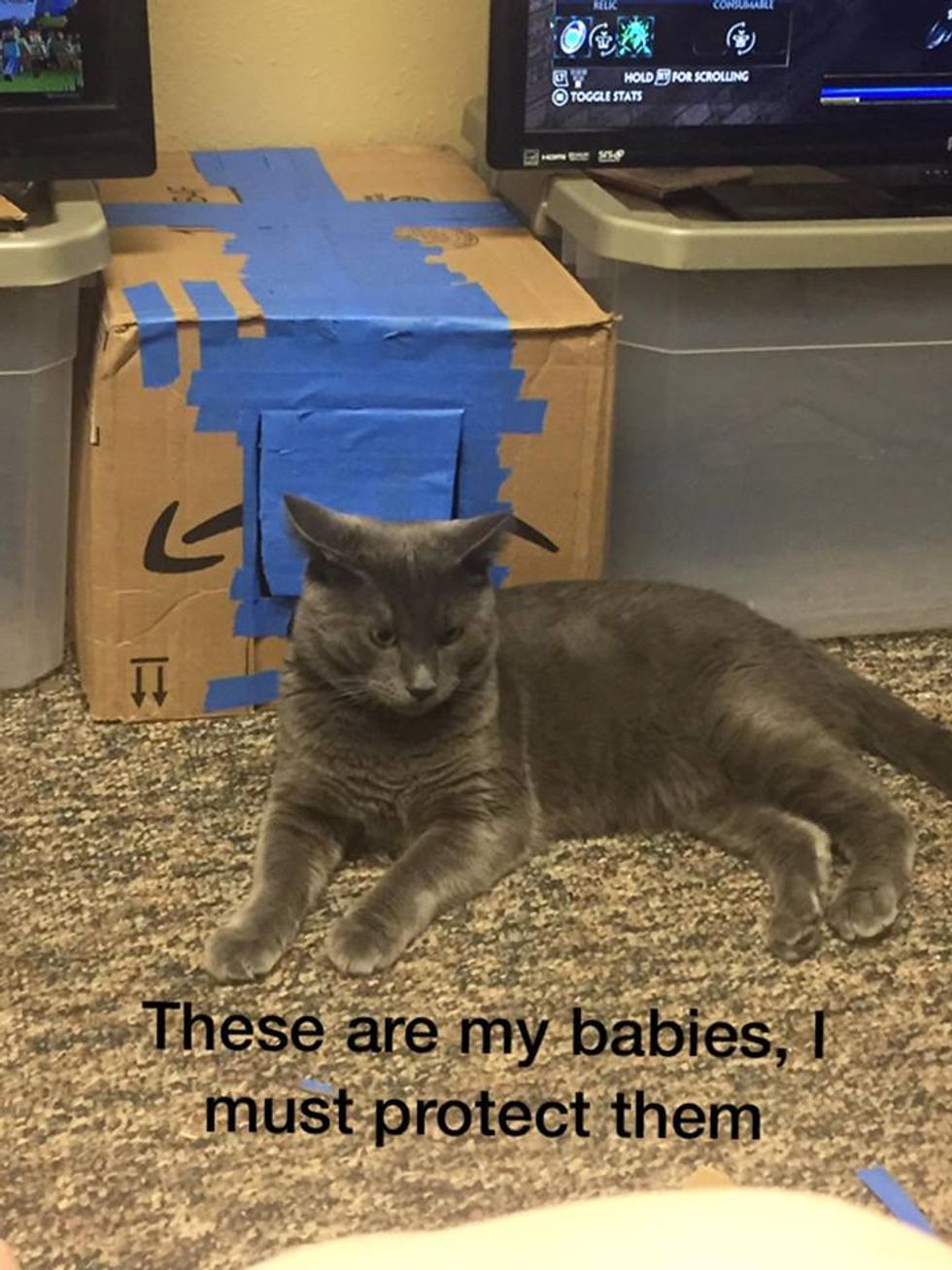 The following day, Taffy's owners returned and they got to go home and meet their father Chewy, who, rather unusual for a father cat, was very involved with them and protective over them. The first night they were home he didn't stray more than two feet from the box the kittens were in.
