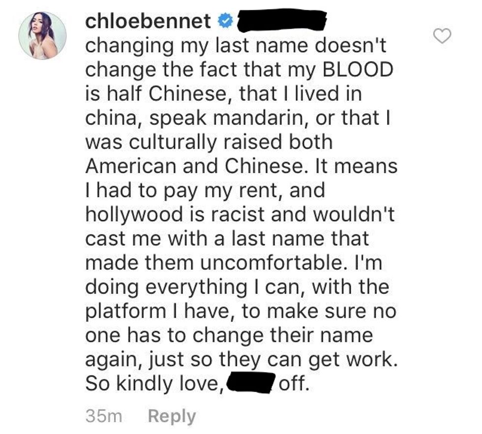 People are angry and are claiming that she is ashamed of her ethnicity of being half-Chinese. From what Chloe has stated, she has never denied the fact that she changed her last name. In fact, Chloe clapped back to an Instagram user saying "Hollywood is racist", and in order to pay her rent she had to change her name to a more comfortable in order for Hollywood casting directors to hire her. It also stated that she said the first audition after she changed her name, she was hired. Below is the exact comment that got everyone talking.