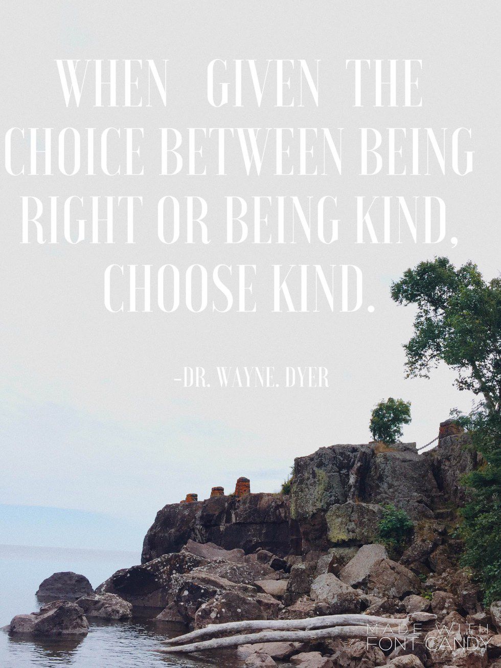 Choosing to be kind is a conscious decision. It is reflecting on the weight of the words that you choose to say, and deciding whether it will cause more harm than good if said. Sometimes, being wrong is a far better consequence to face rather than causing rifts in relationships. When sharing opinions or remaining firm on one's stance, we must always take into consideration the implacability of how what we say affects us and everyone around us. Imagine what it would be like if everyone chose to be a little more kind. By letting go and realizing that being right is not what matters most, we may be able to change the world.
