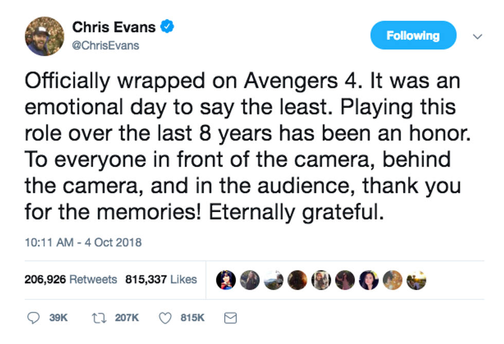 I mean, we all still see Daniel Radcliffe as Harry Potter. Chris has given his time to become Cap and I believe that Cap has become a major part of him. You can't play a character for that long without becoming a part of them.