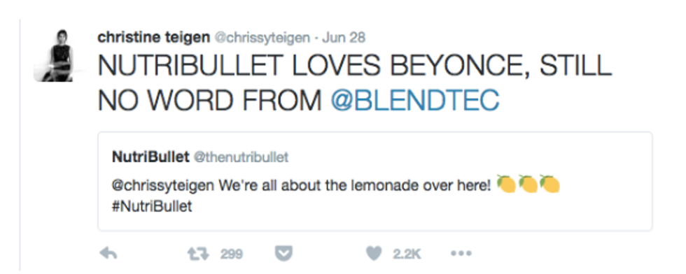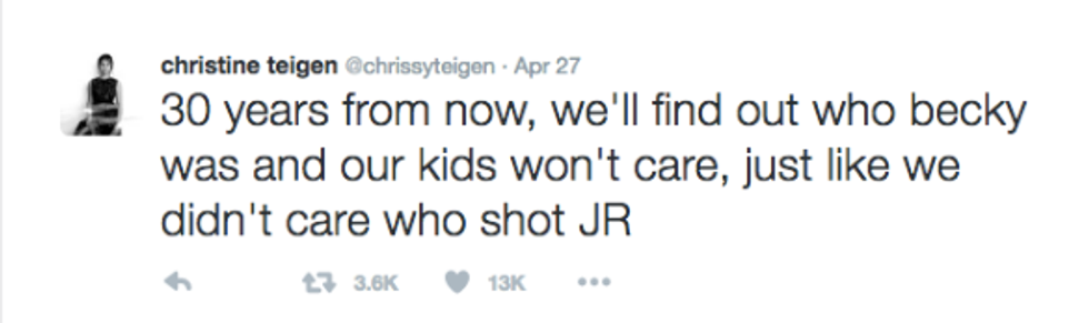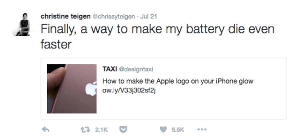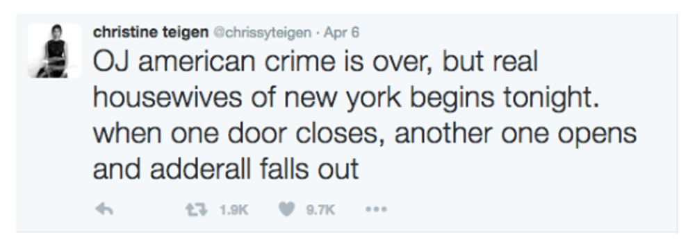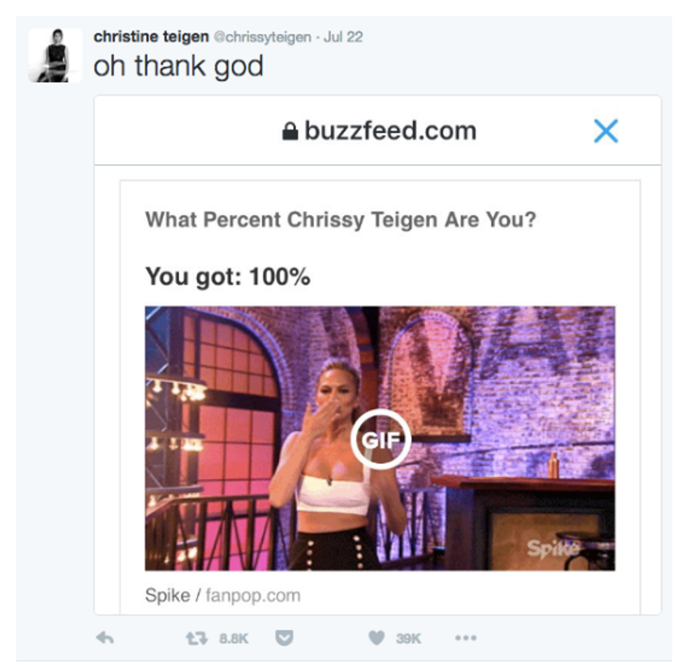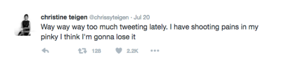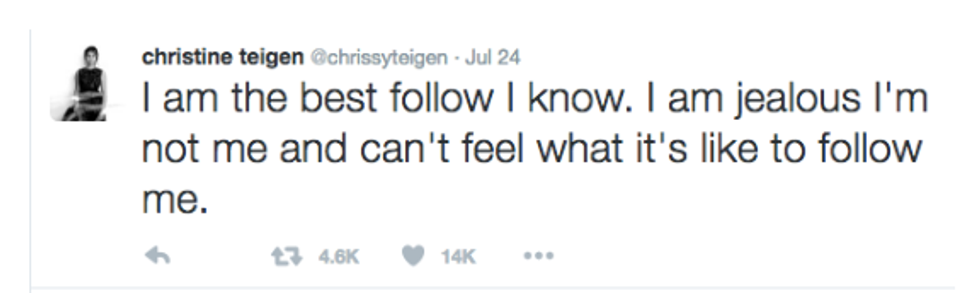 Scroll through Teigen's Twitter feed. I dare you. Her tweets are everything my tweets aspire to be. They brighten up my otherwise lacking feed, to the point I actually deemed it necessary to turn on post notifications. Yeah. It's the real deal.