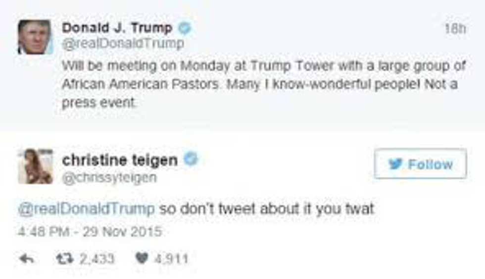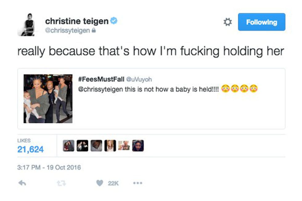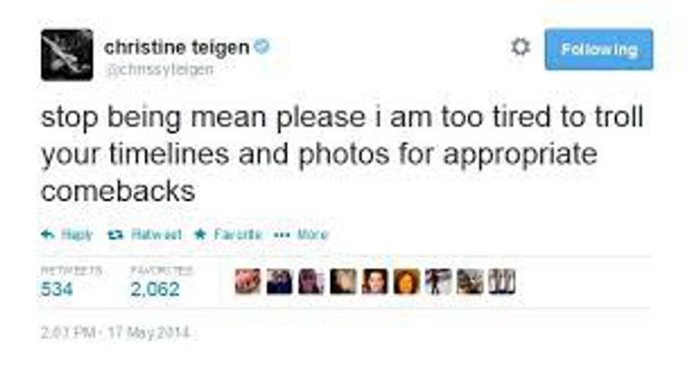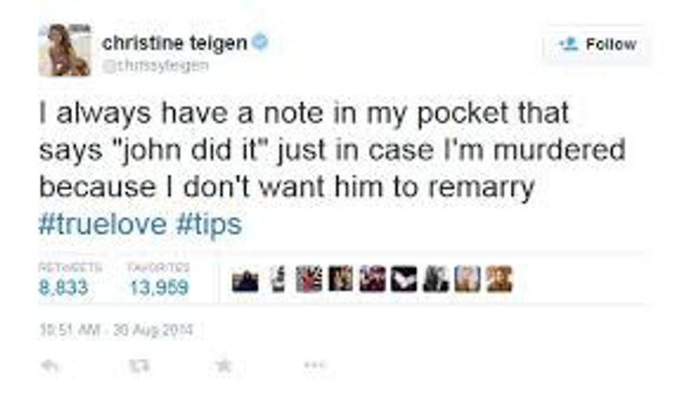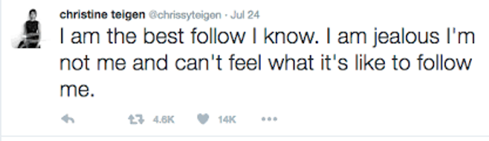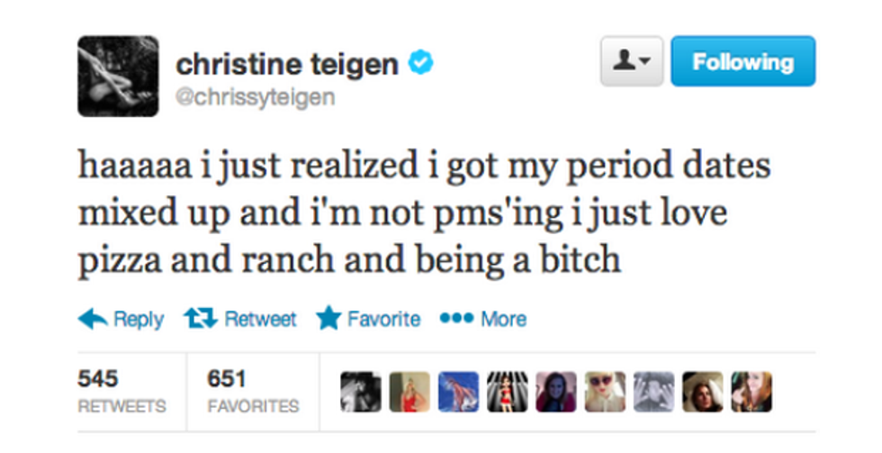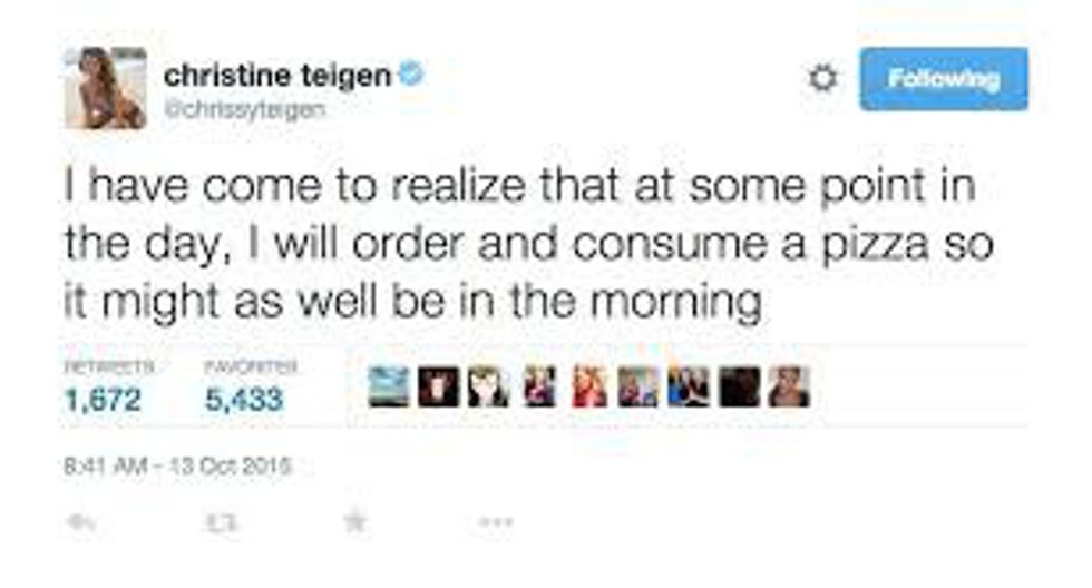 If you are not following Chrissy Teigen on Twitter, then that should be your first New Years resolution. Chrissy is one of the funniest celebrities on Twitter. She will say whatever to whomever and has no boundaries. She tells it how it is while simultaneously being funny. She interacts with her fans, and her many haters, and basically makes you wish you were as cool as her. Here are some of Chrissy's best tweets.