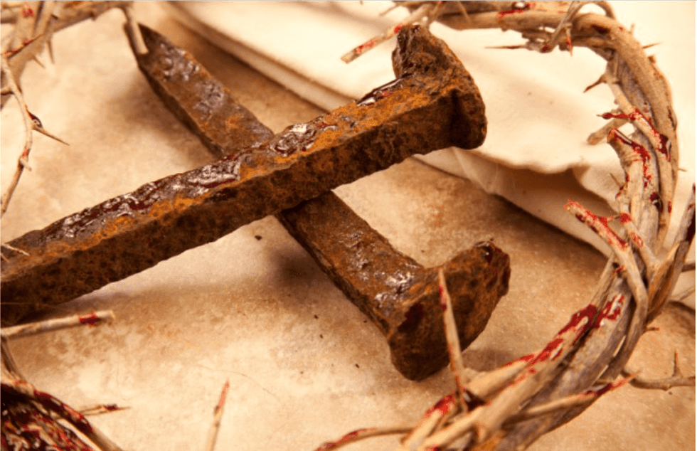 Christ is nailed to the cross and the devil smirks as he taunts,