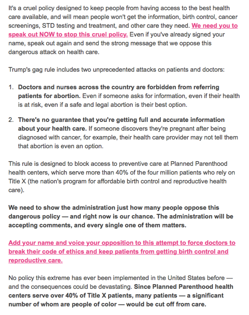 Because of the large religious Trump following, he has decided to issue a "gag rule." Below is an attached description from Planned Parenthood which explains the negative effects from this ridiculous "rule" and a link if you are interested.
