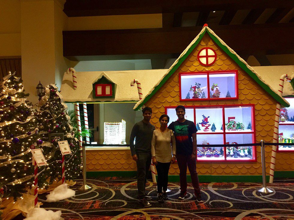 We got out of the airport and headed to a beautiful hotel, where we were guided into the entrance with a series of palm trees that were wrapped with bright lights. The lobby was decked with elaborate Christmas decorations, a big Christmas tree, and festive designs as it was Christmas Eve.