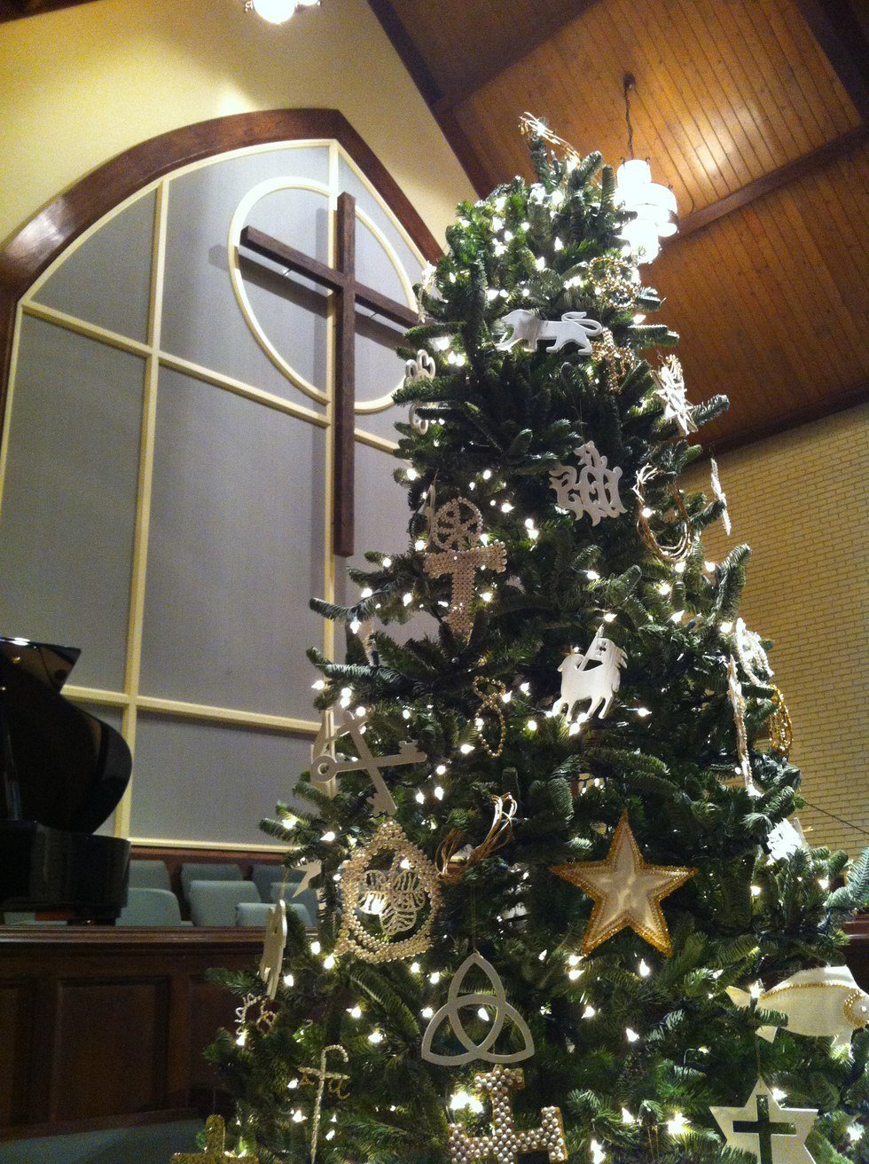 This is one of the Christmas trees at my church. We will walk past it for weeks on the way to attend service, and many times we won't even pay much attention to it. This specific view of the tree is my favorite. Can you see why?