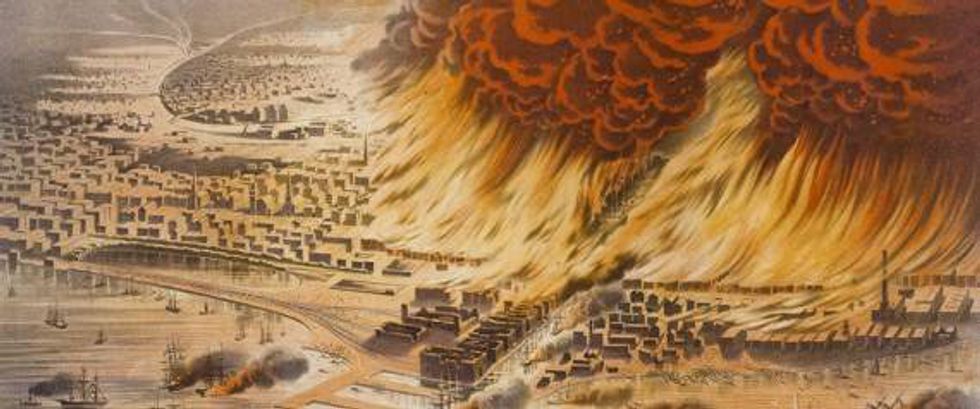 One of the major changes the city underwent was the 1871 Chicago Fire. The fire destroyed a third of the city and left roughly 100,000 people homeless. The initial spark of the fire is unknown but many legends say it to be Ms. O'Leary's cow kicking over a lantern in a barn. Luckily, many of the railroads and factories were spared and the city was rebuilt in an amazingly swift pace.
