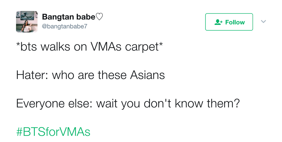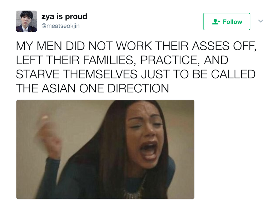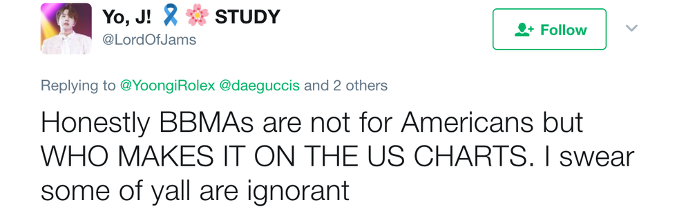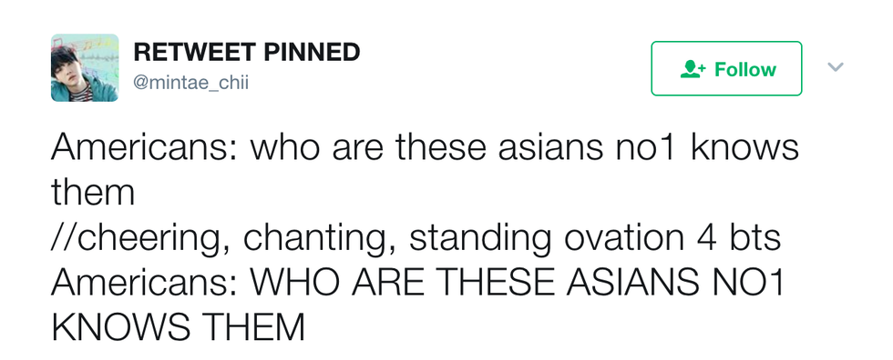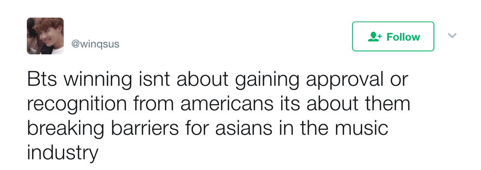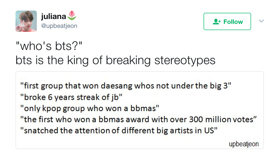 This past Sunday, the 2017 Billboard Music Awards were held. Did I watch it? No. But did I watch clips of highly acclaimed K-Pop boy group, BTS, accept their award for Top Social Artist and offer some well needed and deserved representation for Asian people in Western media? Heck yeah, I did. However, my sweet baby angels did not accept the award too easily. After their win, they were criticized by many people on social media for winning an award at an American award show, often being dismissed as "these Asians". But BTS fans were quick to clap back. Here are 7 of my favorite tweets of fans shutting them down: