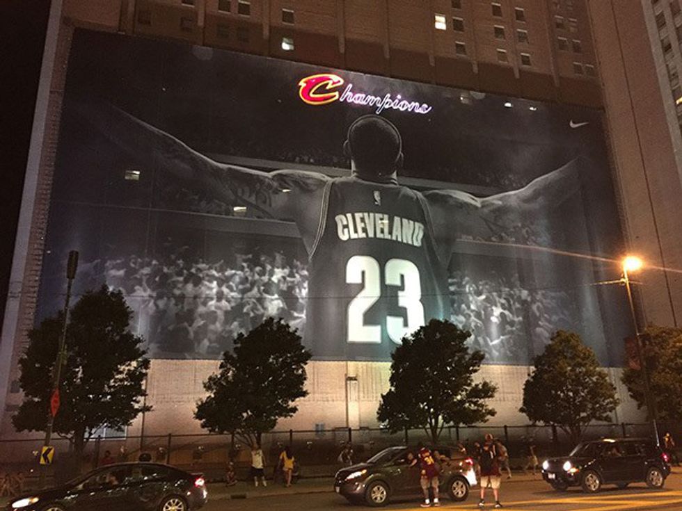 ...it's staying up! The 10-story tall banner of NBA Champion, LeBron James will remain hanging off of the Sherwin Williams Co. Global Headquarters during the RNC, as a result of nearly 25,000 signatures petitioning Cleveland's Paint Company to "Leave it Up!" The "This Land is Our Land: 150 Years in Cleveland" banner idea has officially been thrown out.
