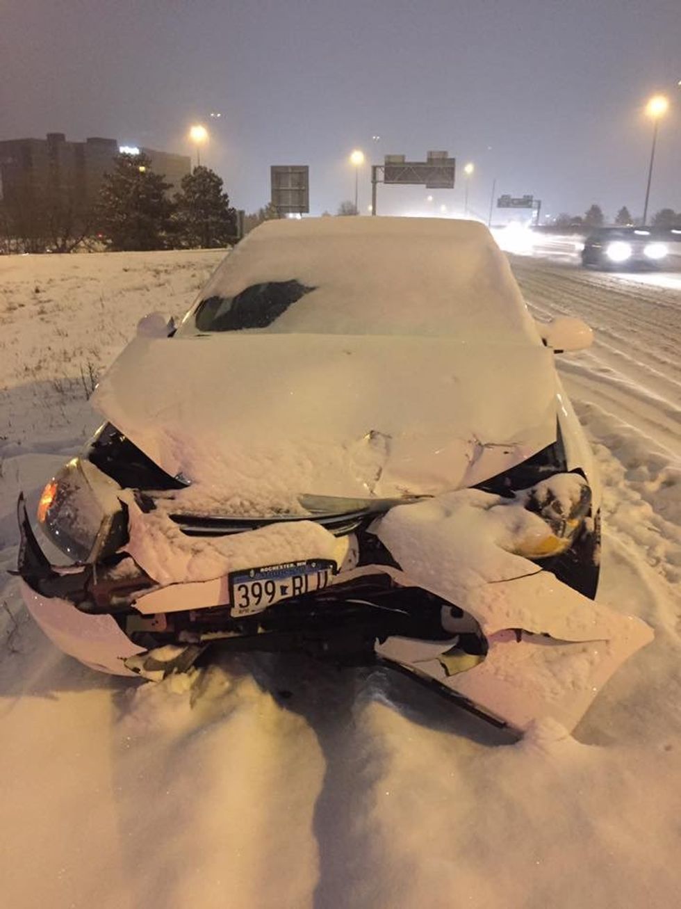 The entire time we were enjoying ourselves it was snowing. And by snowing I mean, snowing. There was at least an inch of snow on the soccer field and much more piled elsewhere. My parents were concerned about the snow prior to the game but I made it clear that I wanted to go to this game no matter what. As we were driving to get my car the snow did not seem much worse than anything I had driven in before. Just constant snow, not too heavy, not too wet. So as I said goodbye to my dad and pulled out of my parking spot I was feeling good. I would be back on campus in less than an hour.