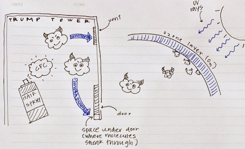 Hairspray contains Chlorofluorocarbons (CFCs) - a group of chemicals made up of chlorine, fluorine, and and you guessed it, carbon. When these compounds are released into the air (yes, molecules DO fit under doors and through air vents) they slowly make their way up into the atmosphere. That's that thing that encircles the planet and hosts the ozone layer, by the way. The Ozone, whose molecules are made up of three oxygen molecules, is our friend. It filters UV radiation, and keeps us from burning to a crisp. Those UV rays, they come from the sun.