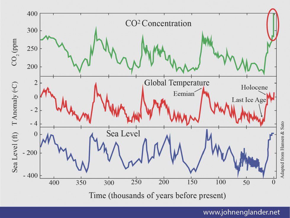 As you can see, the concentration of carbon dioxide, global temperature, and sea level are all directly related. As CO2 concentrations rise, so does temperature at roughly the same rate. CO2, as well as other greenhouse gasses, are currently increasing at a much faster rate than ever before. Because of the rapid increase in greenhouse gasses, temperature is also increasing more rapidly than ever before. And guess what? Humans are the main source of greenhouse gas emissions.