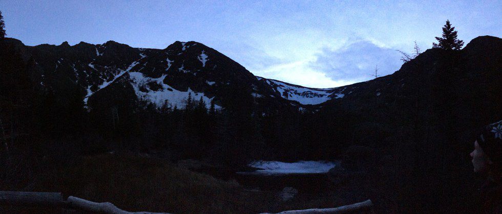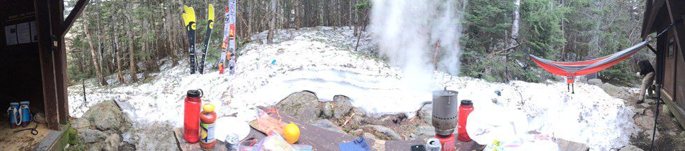 A few hours later, we reached the area where we would be staying in a lean-to for the night. We brought our hammock to hang in the trees and our pots to cook some pasta, but not long after settling down and eating dinner, we headed to our sleeping bags. It was definitely difficult falling asleep on the floor of a lean-to because it was freezing and personally, I was terrified of all the spiders running around me. But before I knew it, I was waking up getting ready to make the final summit to spring skiing.
