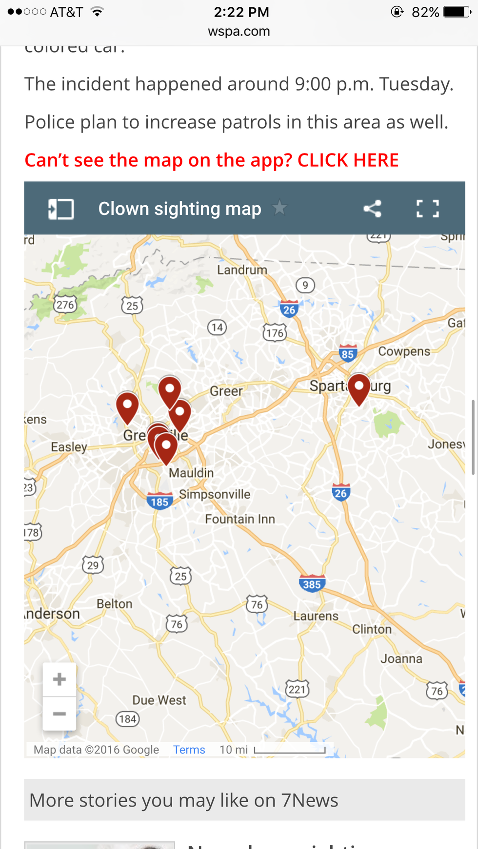 Many people are starting to believe that this is a hoax, while others believe it is simply a publicity stunt because of the new "IT" movie being released sometime soon. Either way the Greenville County and now Spartanburg County Police Department aren't taking this as a joke. The reasoning that they aren't taking it lightly is because there have been numerous accounts of this strange behavior and pictures. None of the pictures have come out clearly because it is dark and the clowns always run away once they see them pull out the cameras. Below I have attached a map (courtesy of www.wspa.com). As you can see the clowns are staying pretty closely together in when they are spotted in Greenville, except for the one sighting in Spartanburg.
