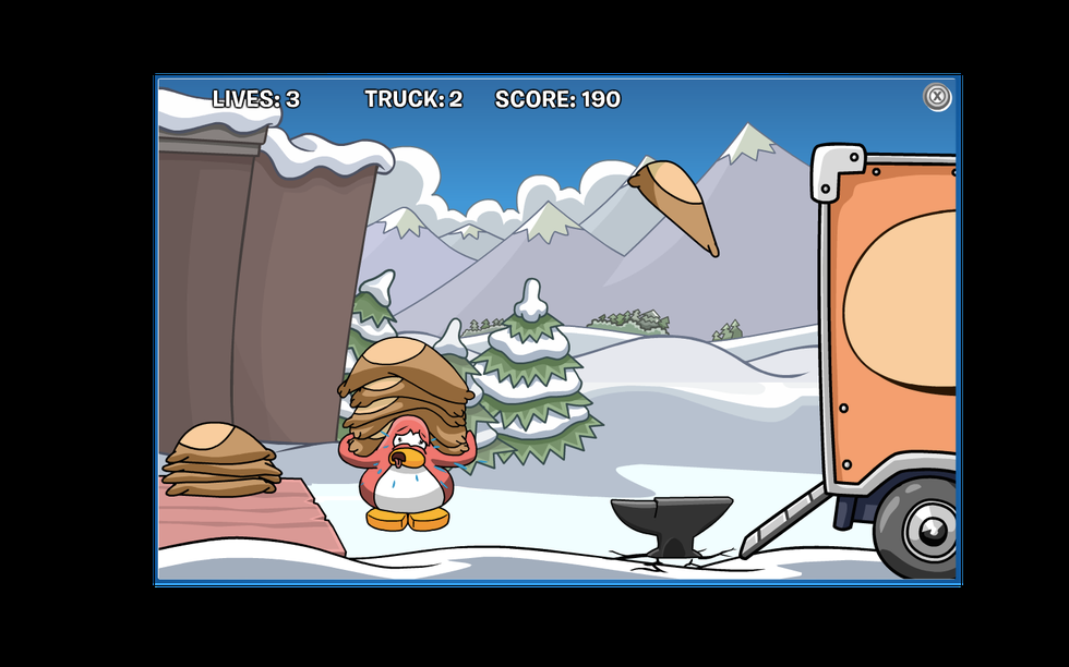 After spending all my coins on ugly clothing and a walking fluff ball, I realized I needed to make a living for myself (so as to continue my luxurious penguin lifestyle). As my experienced penguin self remembered from the olden days, the way to do that is by playing games. So immediately I went to what I remember being my favorite one, bean counters. In this game, you have to move your penguin from side to side in order to catch sacks of coffee beans as they are launched out of a delivery truck, while avoiding unwanted objects such as dead fish and flower pots.