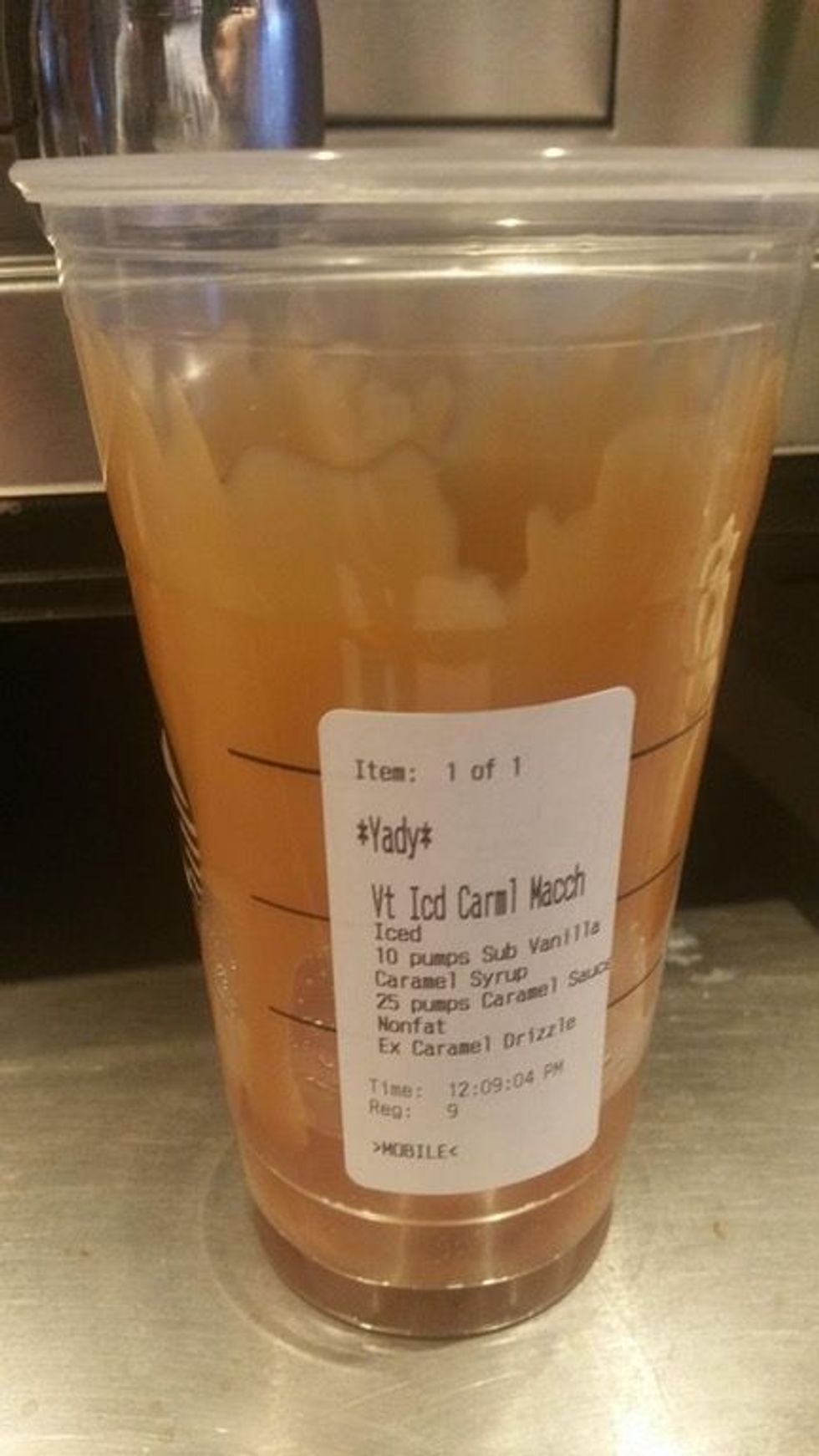 7. A large decaf caramel macchiato with 10 pumps of vanilla, 25 pumps of caramel, non fat milk, and extra caramel drizzle.