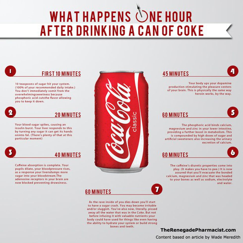 For years, doctors, food experts and health critics have touted to the world that soda is bad for everyone. They cited increased risk of diabetes, obesity, tooth decay, weight gain, depression, kidney issues and heart diseases, just to name a few, as part of the scary effects of soda. Often, people get lost in the medical jargon and chemical names, and then just decide they don’t care enough to research them and find out what is really going into that can of Coke they're drinking. A pharmacologist who writes under the name “Renegade Pharmacist” took this information and put it into a infographic (pictured below) that breaks down just how all those chemicals really affect your body in just one hour (and beyond).