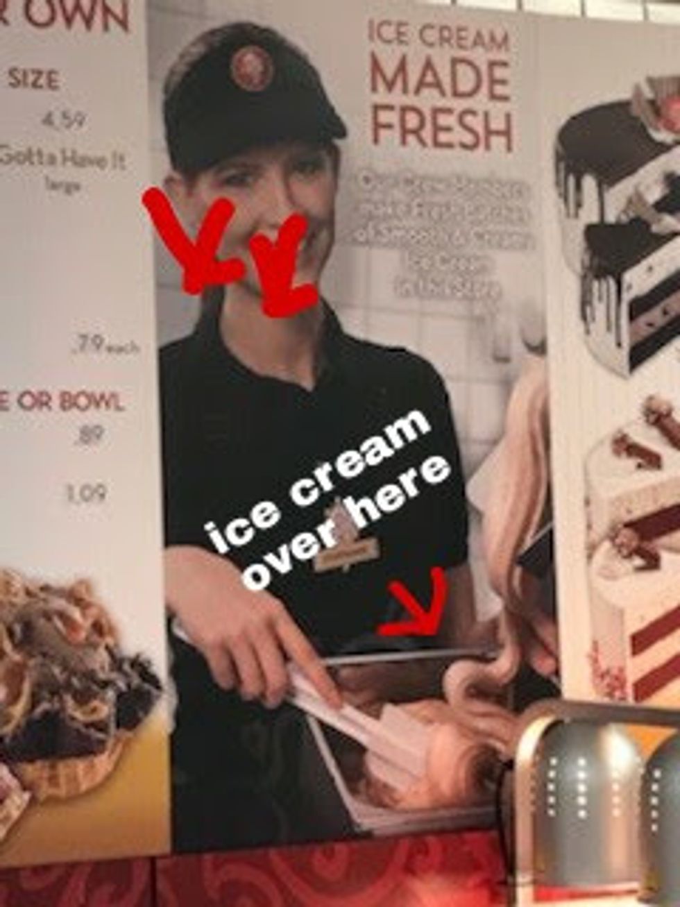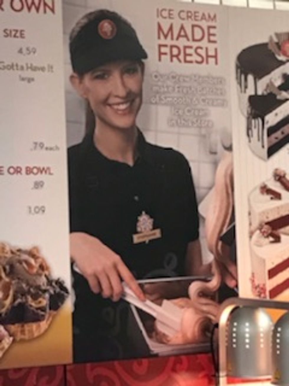 You probably can't read the sign, but it says, "our crew members make fresh batches of smooth & creamy ice cream in this store." This makes me worried because Exhibit One's eyes are not looking at the ice cream she is supposed to be making, which seems like a fundamental rule of anything.