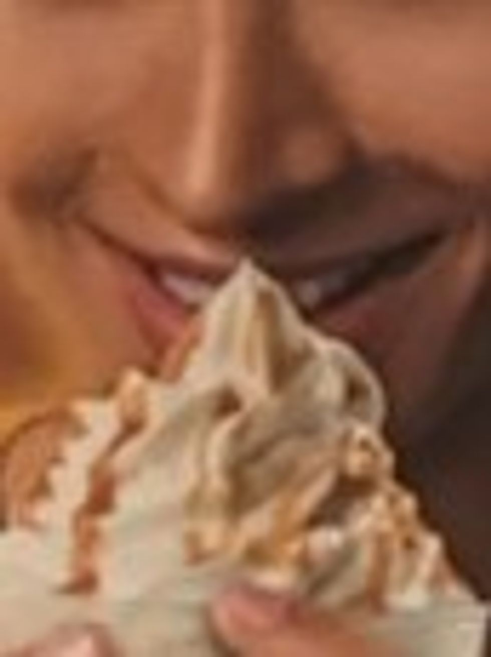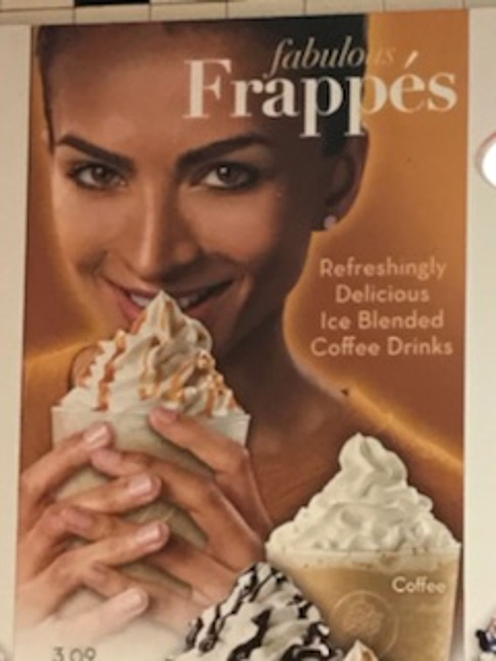 This model seems to have an unnatural glow, and I don't like it. Either she has been training for years and finally achieved Legendary Super Saiyan or these "Refreshingly Delicious Ice Blended Coffee Drinks" have something fishy going on with them. Like the fact that they MAKE YOU GLOW.