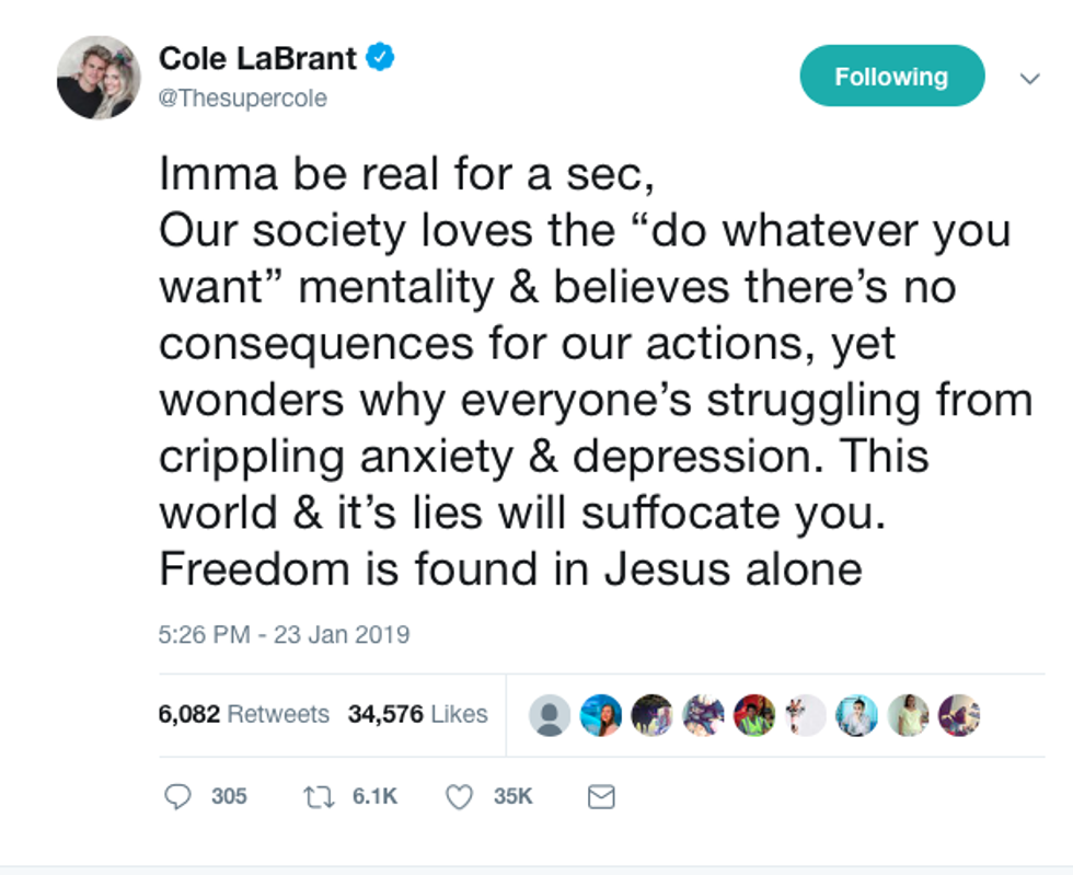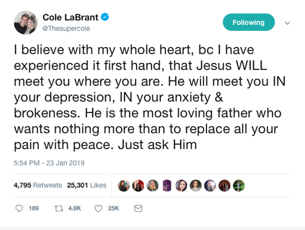 Did he mean harm and malice by it? Probably not. I think he was just trying to give all of his love and thanks to God, which he commonly does. BUT that's not at all how his tweets came across for me, someone who suffers from anxiety and depression.