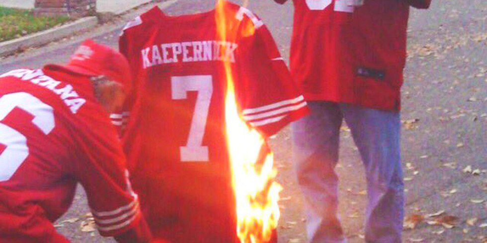 Later on social media, a lot of non-49ers and 49ers fans burned his jersey after what he did and tweeted that he's a traitor or he's disrespecting the military who fought for America.