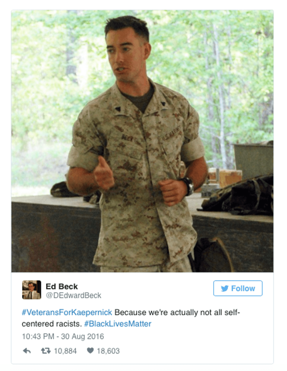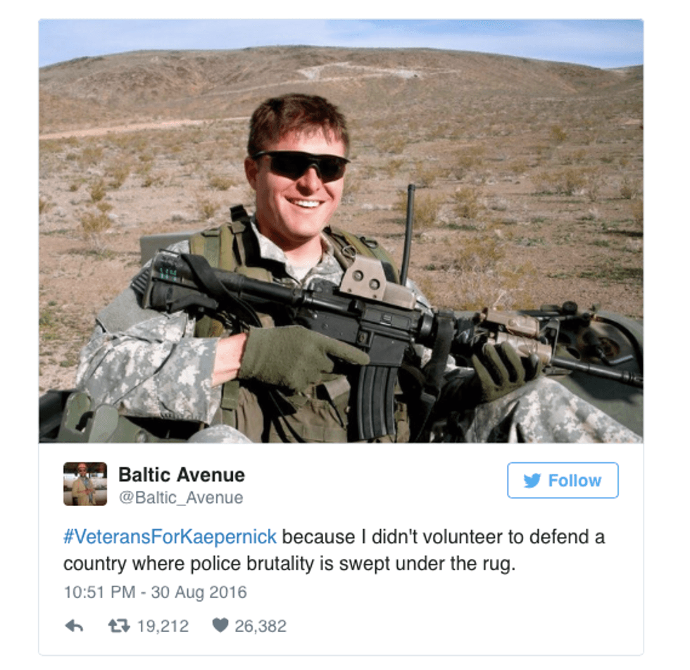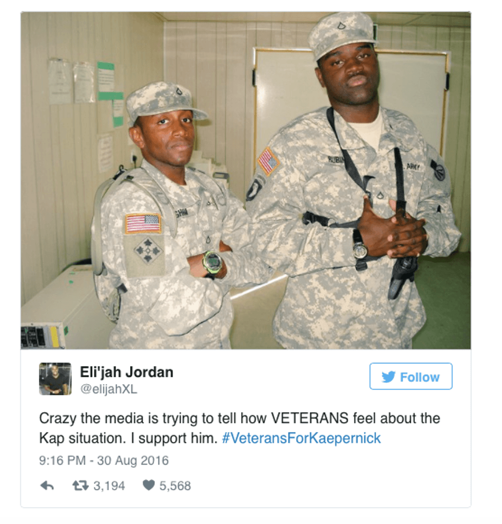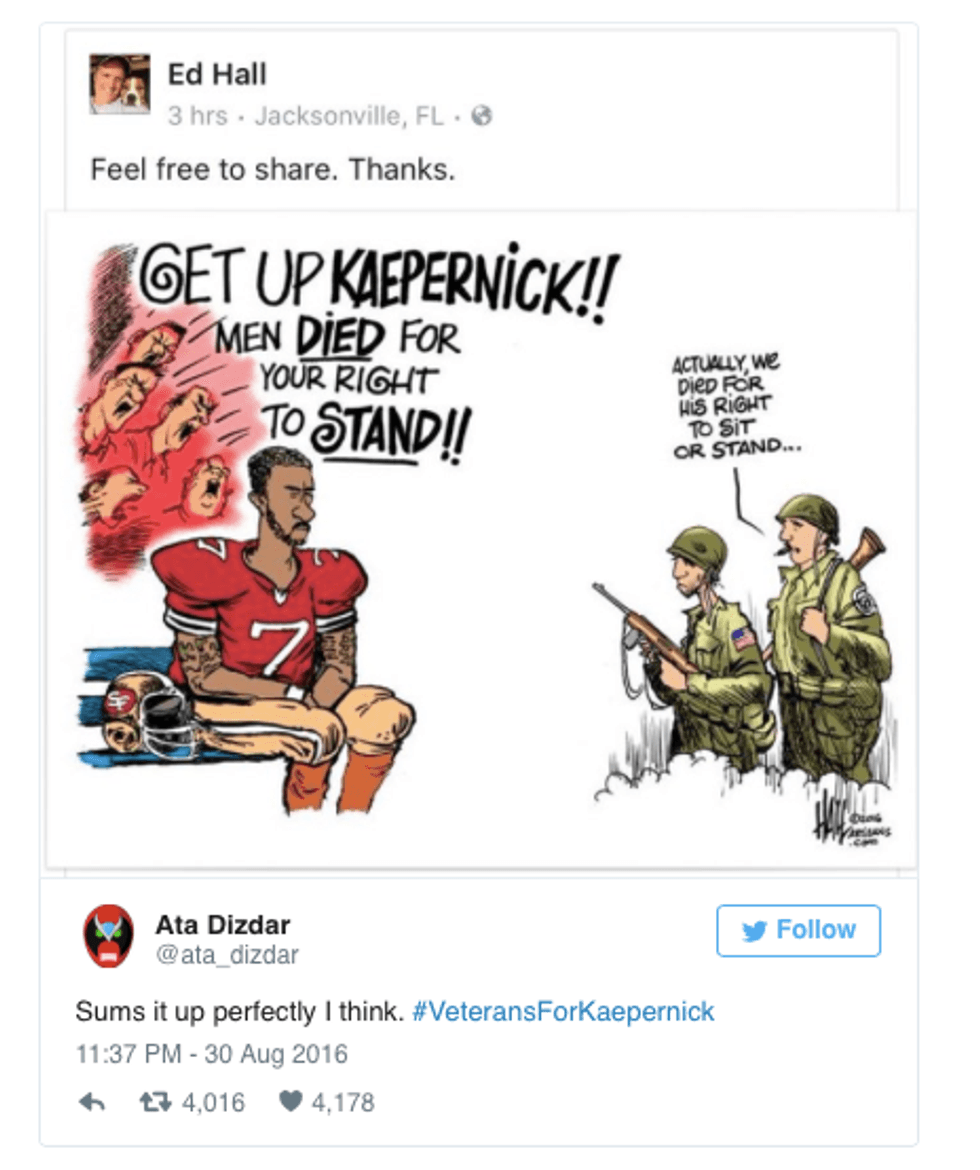Many in opposition view Kaepernick’s reluctance to stand during the National Anthem as a direct attack on our troops, though in his reasoning there is no mention of our service men and women. Interestingly, military service members came together to show support for Kaepernick’s peaceful protest against the injustices facing minorities to this day.