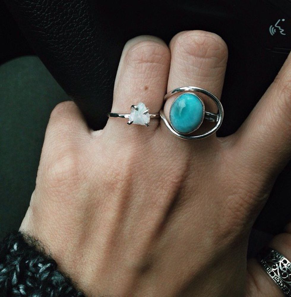 This rainbow moonstone is without a doubt my favorite piece. This was the first ring I got and it’s the one I never leave home without. Said to be the traveler's stone, moonstone is a good protection stone, especially during a full moon. Moonstone is also believed to be a stone that promotes calm and soothes the subconscious.