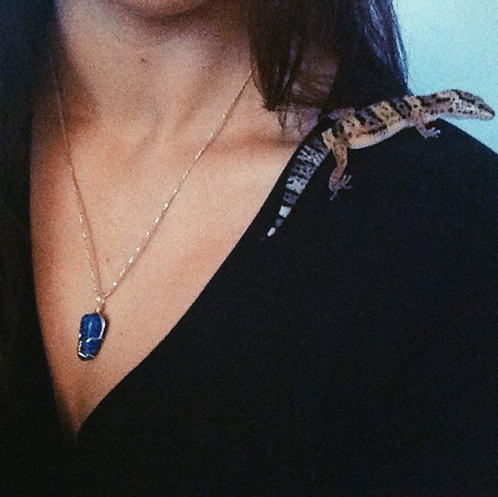 This stone activates a creative mind and aids in knowledge and understanding. It is a stone that is believed to reveal truths, and therefore facilitates learning and enhances memory. I’ve always wanted a lapis lazuli and decided to get this one wrapped at the local jewelry shop. This picture also features my gecko, Teddy.