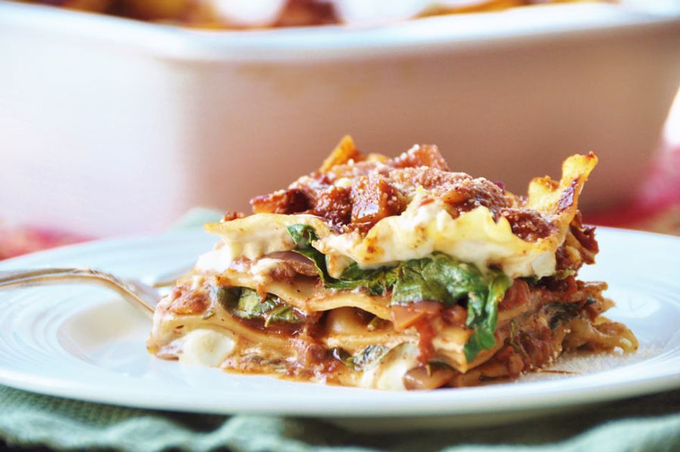 *I've been just fine with just one recipe of the ricotta and 1 lb. of spinach due to my lack of the two, but if you're into thick lasagna you might want to follow the recipe more precisely.