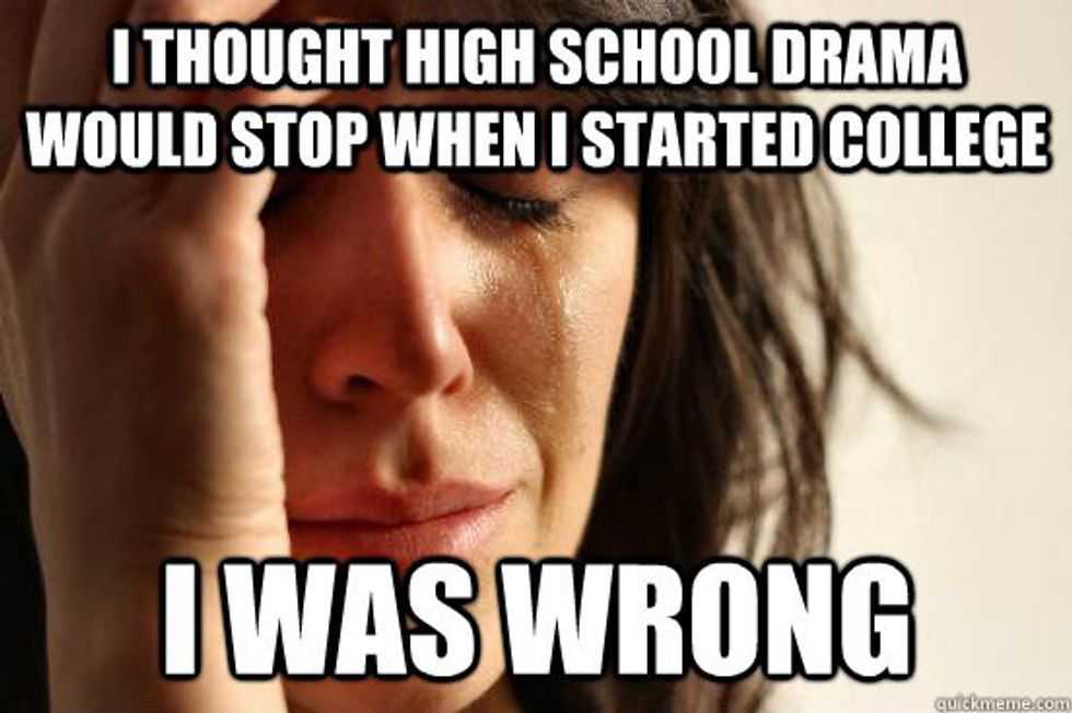 No matter how old you are, there's always going to be some drama going on, whether it involves you or something that you've been pulled into. Whether it's talking crap about someone behind their back or cheating on your partner with their best friend, drama is something that is inevitable. It's just unfortunately part of life you can't avoid. There will be drama in college, clubs, work -- you name it. People are very friendly and down-to-earth in college compared to high school, but there will always be people who have never matured and just live to start drama. That's just something that will never change.