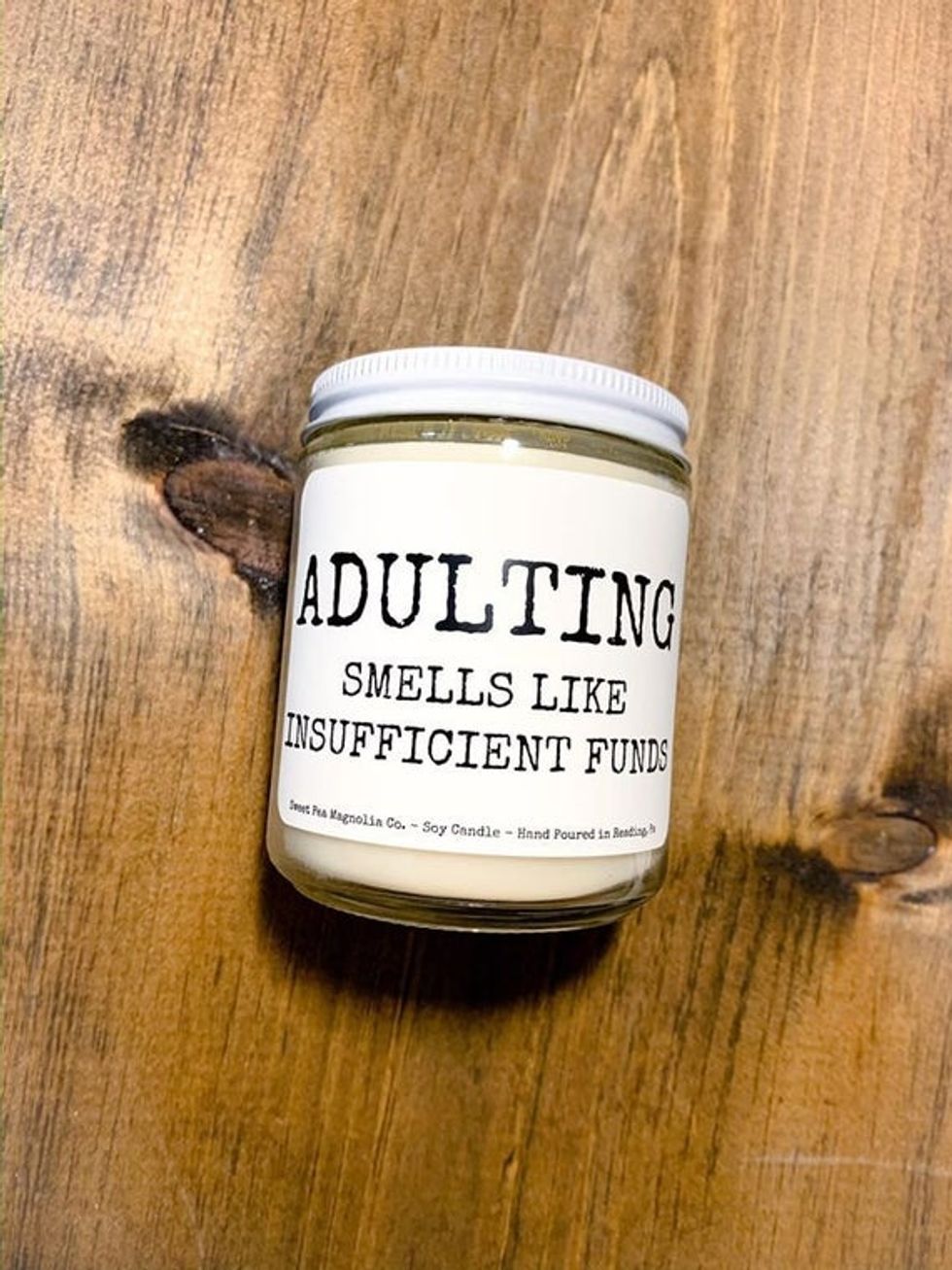 7. "Adulting smells like insufficient funds" candle with large variety of scent options