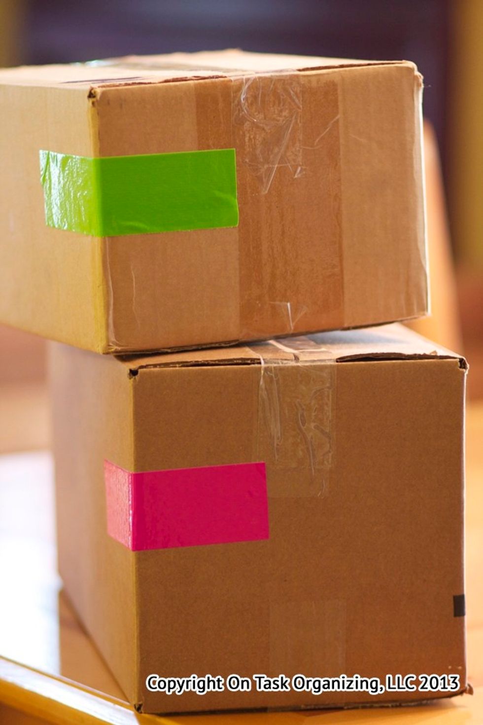 http://www.ontaskorganizing.com/color-code-moving-boxes-with-duct-tape/