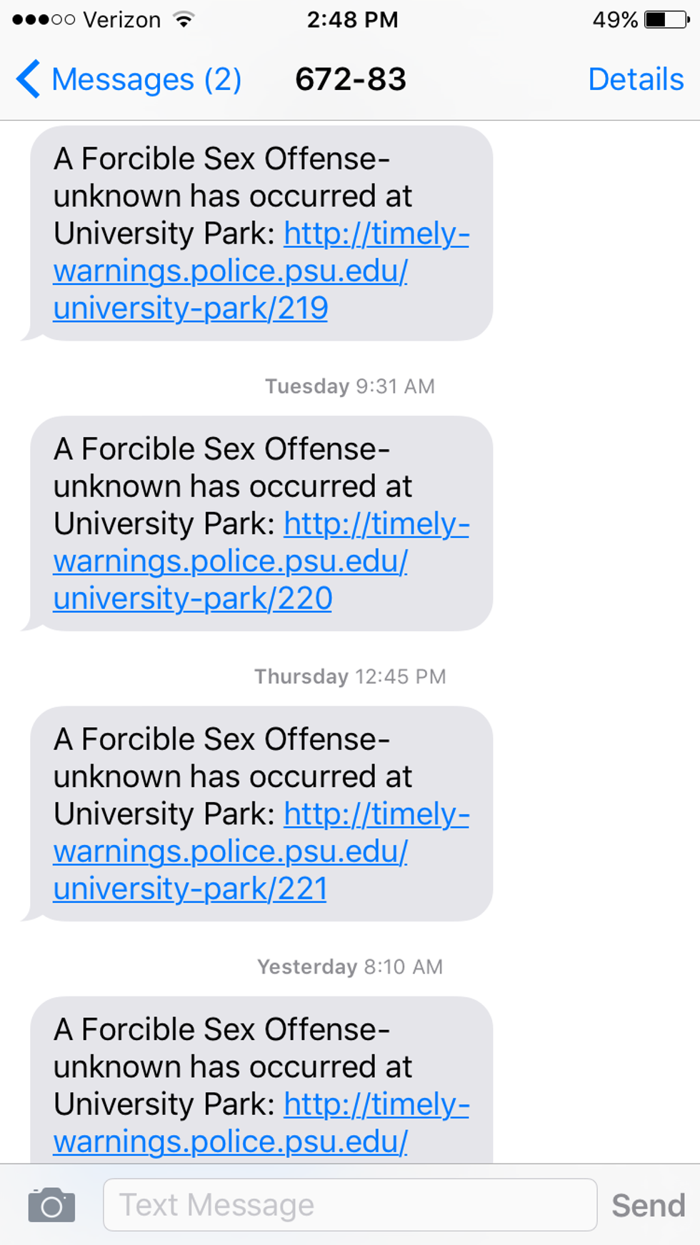 It's 12:30 in the afternoon and I'm sitting in my math class when I notice that my phone is lighting up on top of my backpack. Thinking that it's just one of my friends texting me about meeting up to go to the gym or something, I peer over to see it and instead find a text from my school's campus alerts. It reads: A Forcible Sex Offense has occurred. Another one. Being that it was in the middle of the day, I was caught off guard. I stare at the text with disbelief, very confused as to why this is still happening so frequently.