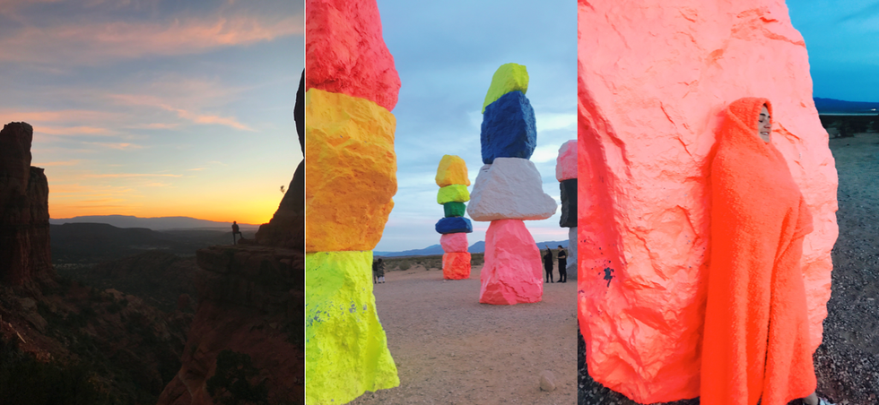 The Hyatt Village of Sedona with pink jeep tours and mystical psychic reading options is tempting, but the paramount vortex hikes are much better. Dreaming of the Grand Canyon? It’s foggy and depressing. Talk to locals, explore Pinterest. See antelope canyon and the wave. Enticed by The Vegas Strip? Bad idea. Stay on the highway. Get off at Exit 21. Visit the Seven Magic Mountains. But hustle, because they’re gone on May 27th.