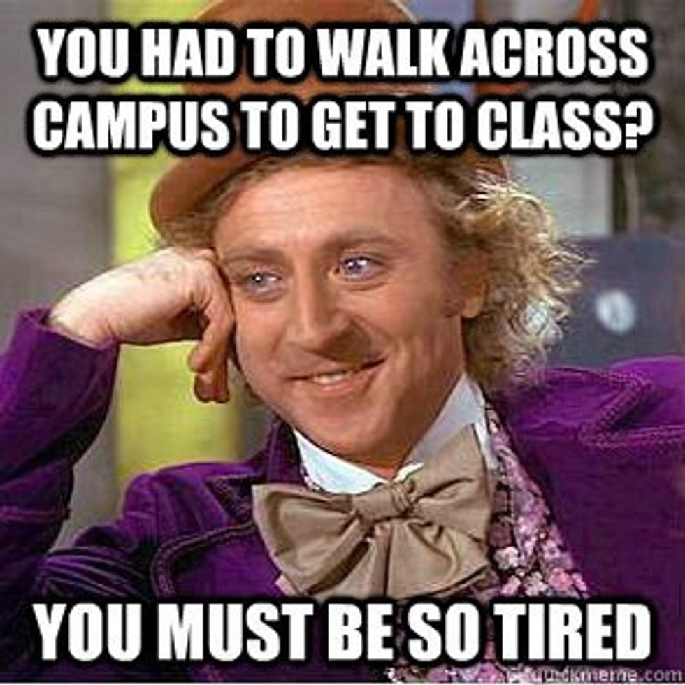 Whether you love walking or hate it, walking all around campus is an annoyance when you have to dress nice (ex. walking campus in heels suck) or it is pouring rain. Once you graduate you'll be able to drive everywhere and barely have to walk again.