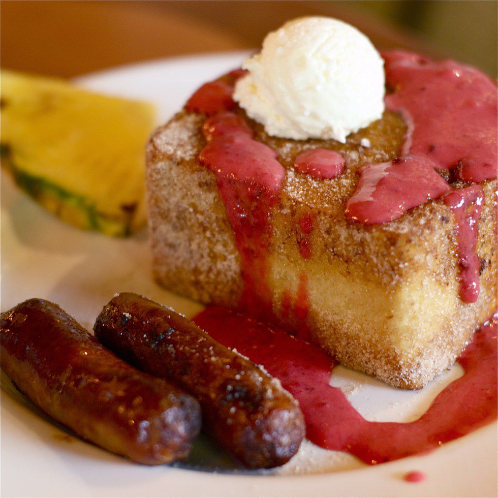 And you should also really know about this next one-- it's called "Tonga Toast". It's two pieces of french toast with a layer of bananas between them, deep fried, and covered in their amazing strawberry sauce. This thing makes the dining hall french toast look like donkey turd.