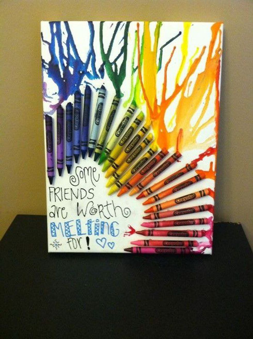 This canvas is a great idea and would look awesome on your friend's dorm room wall! All you need is a canvas and some crayons.