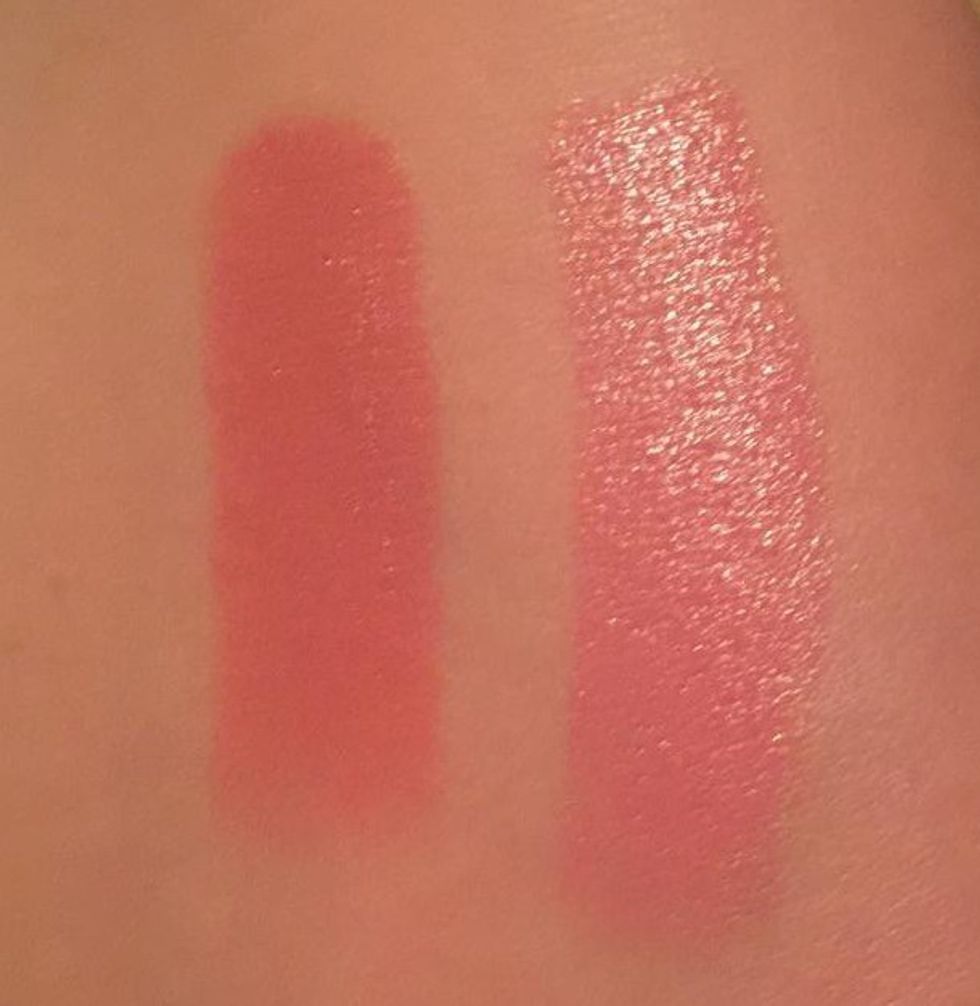 The one on the left is my personal favorite, it is from NYX in shade Tea Rose (~$6) and the lipstick to the right is Bare Minerals in shade Speak Your Mind ($18). I find the one on the left to be longer wearing and to have higher pigmentation.