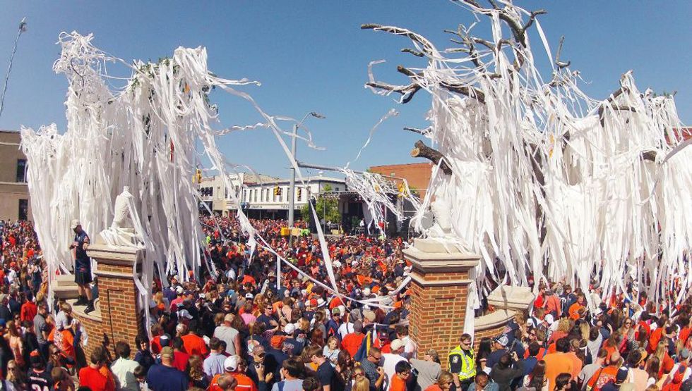 Last week, for the second time in two years, the Toomer’s oaks were uprooted and replaced. The original oaks, which were approximately 75 years old, were maliciously poisoned in 2010; the agricultural school spent a couple years nurturing and trying to save them - but the poison did too much damage and the trees ultimately died. Rolling festivities were halted while the trees were “sick” – but that didn’t stop Auburn fans from gathering at the corner for celebrations.