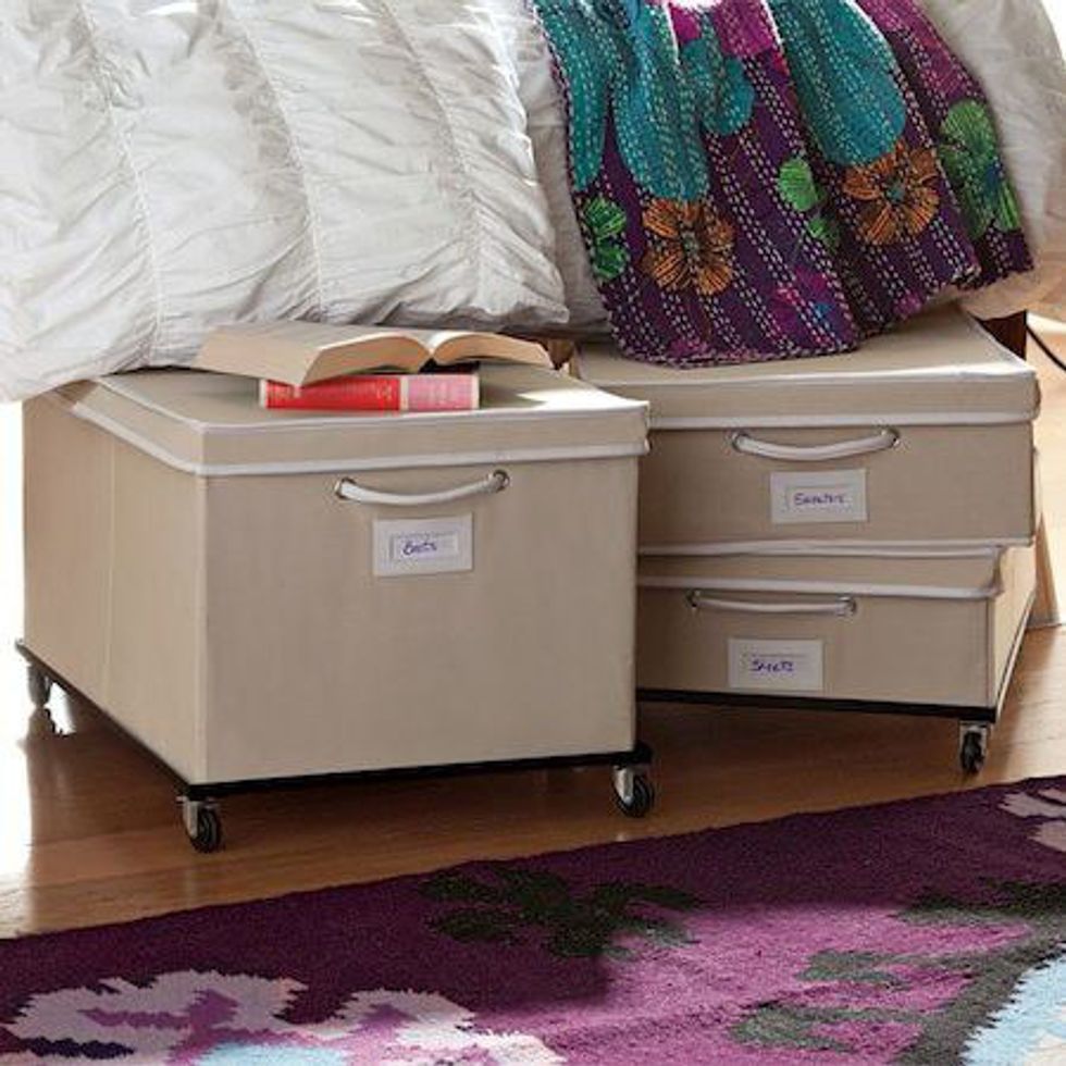 An ottoman was one of the most useful things I bought for my dorm. In it, I stored my laundry detergent, dryer sheets, lint roller, Clorox wipes, tissues, and other useful cleaning items. Putting a certain category of items (such as cleaning products) in the ottoman, you know exactly where they are when you need them. Rather than taking up valuable space in your drawers or under your bed, storing things in an ottoman keeps them out of sight, but readily available on laundry day, or when you need to clean you room. Plus, ottomans are a cute addition to the dorm, and easy to pick up and move on move in day. And depending on how high you decide to raise your dorm bed, the ottoman can be used as a helping hand when jumping up into bed!