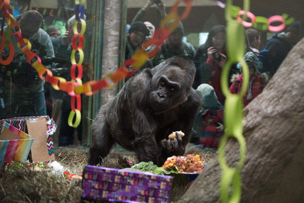 On what would unknowingly be her last birthday, on Dec. 22, 2016, she was made queen for a day. Celebrities such as Betty White and Wayne Newton sent congratulatory messages to her; the public did as well using the Twitter hashtag #ColoGorilla. Colo also received many presents from the zoo staff, which were mostly her favorite food treats such as clementines, apples and tomatoes. She also received enrichment items such as baseball caps, boxes, raffia paper and flowers. Also, the birthday-girl received six edible gorilla-friendly cakes that were dubbed “Six Decades of Decadence” in honor of her 60 years. When Colo arrived to her birthday party, the area in her enclosure was festooned with colorful paper chains, and she wrapped herself in those. You could sense the love and happiness she felt as she explored her gifts, cake and toys. She smiled.