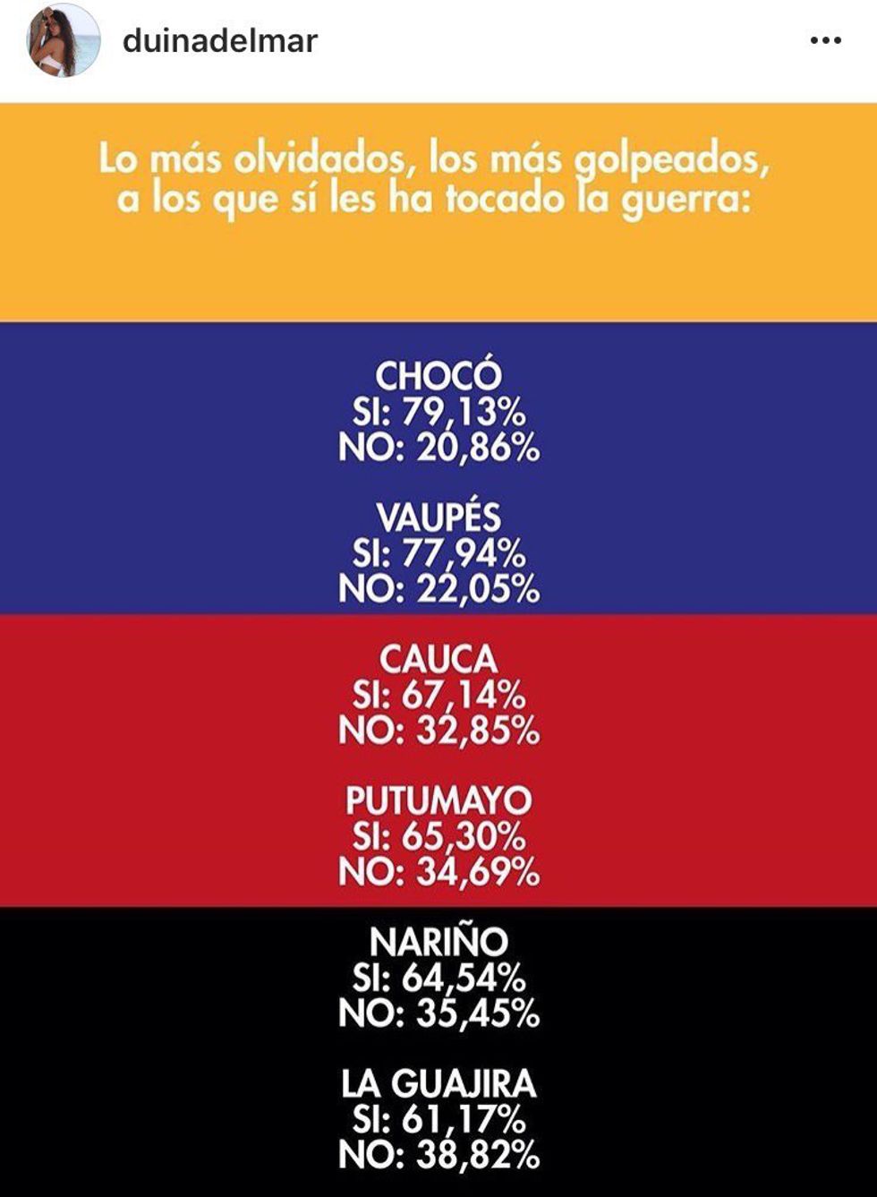 Ex-president of Colombia, Alvaro Uribe, whose father was presumably killed by FARC members in 1983, leads the coalition. The supporters of NO, believe the government is working alongside, not negotiating with the FARC, by giving them a “slap on the wrist” so they can continue using their power to wield votes in their favor (like they did in regions in rural Colombian whom voted overwhelmingly +60% in favor of SI). FARC could remain intact and transform themselves into a militaristic political party that would eventually adopt and implement policies similar to those of Venezuela’s Castro or Maduro or Cuba’s Fidel Castro. Many Colombians voted no in fear that the country they’ve known, represented and loved will turn into a leftist dictatorship similar to that of it’s neighboring state because of the overpowering fear guerilla groups have instilled in the souls of the public through their tactics of political intimidation, violence and kidnapping that has been occurring for decades. The voters of NO believe the accords must be revisited in terms that will keep Colombia from becoming a proxy government ruled by a military dictatorship in the future.
