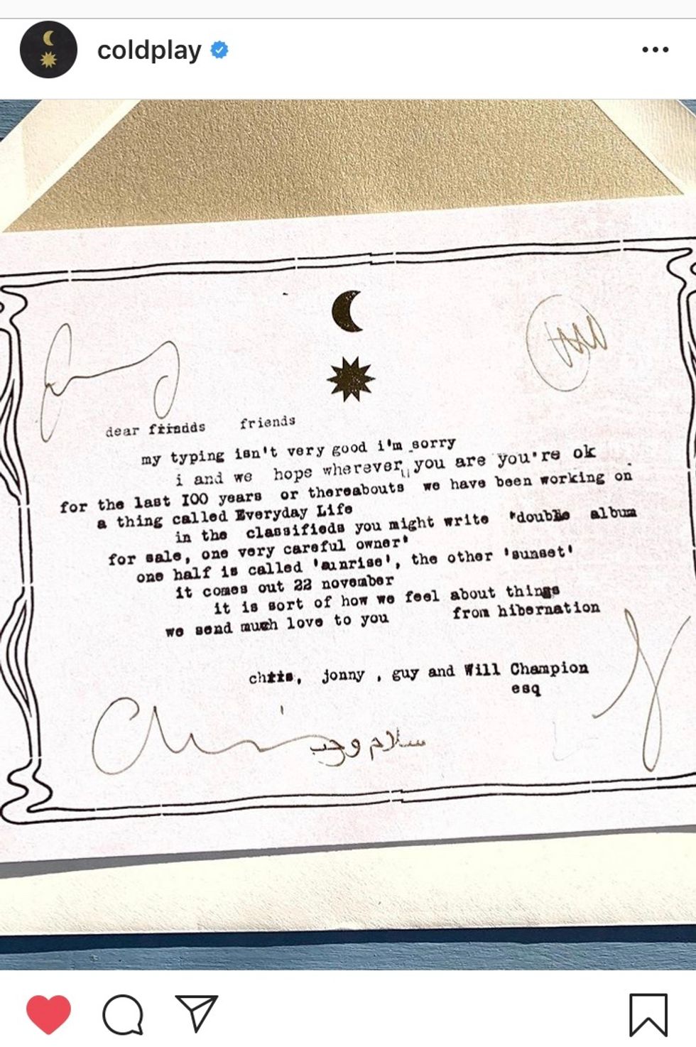On October 22, 2019, Coldplay posted a picture on their official Instagram page: