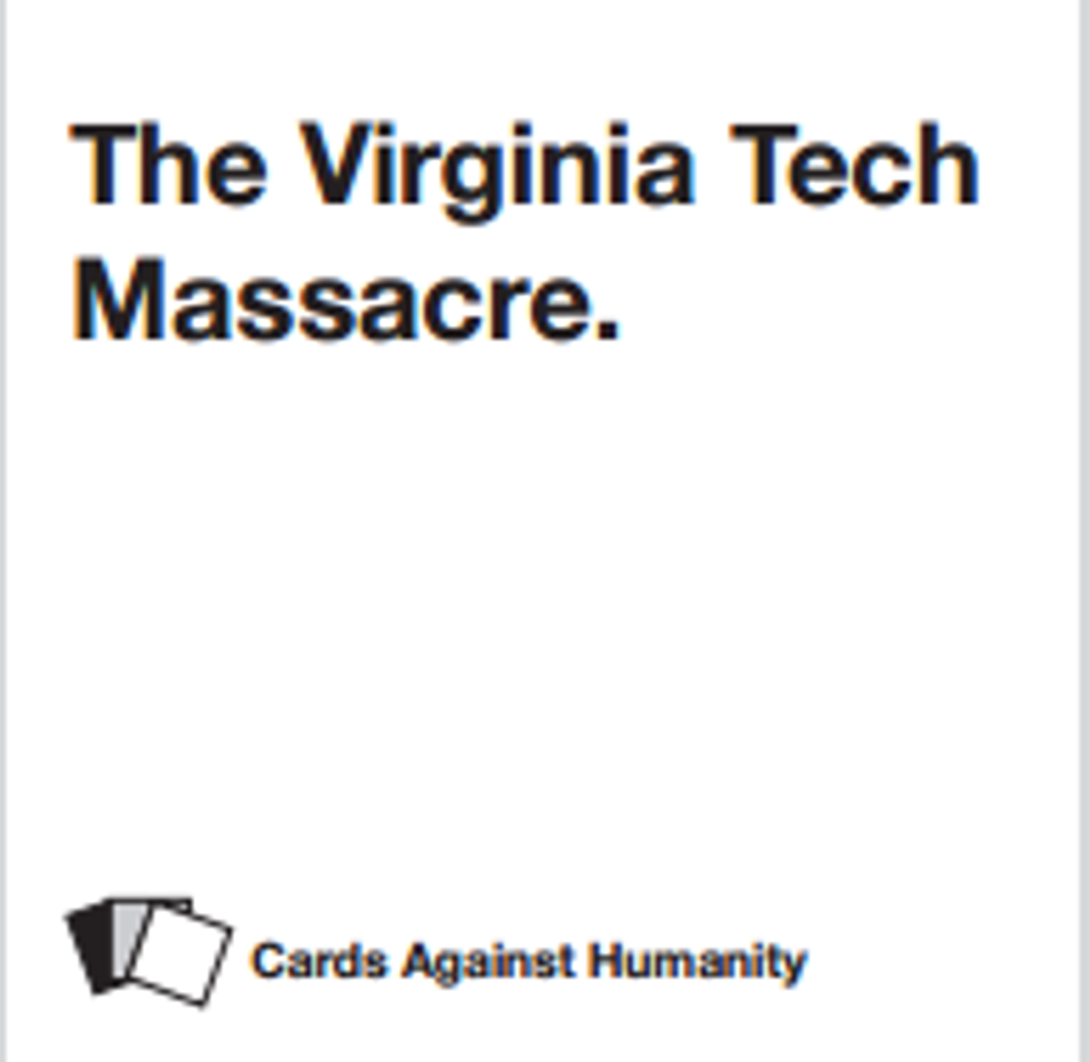 This card belongs to the original and downloadable Cards Against Humanity game, implying that this is a subject matter which we can now laugh about because, after all, enough time has passed. Some people, according to this Reddit thread, have opted to remove the above card from their deck, along with others that are particularly offensive, and deal with homophobia, transphobia and racism.